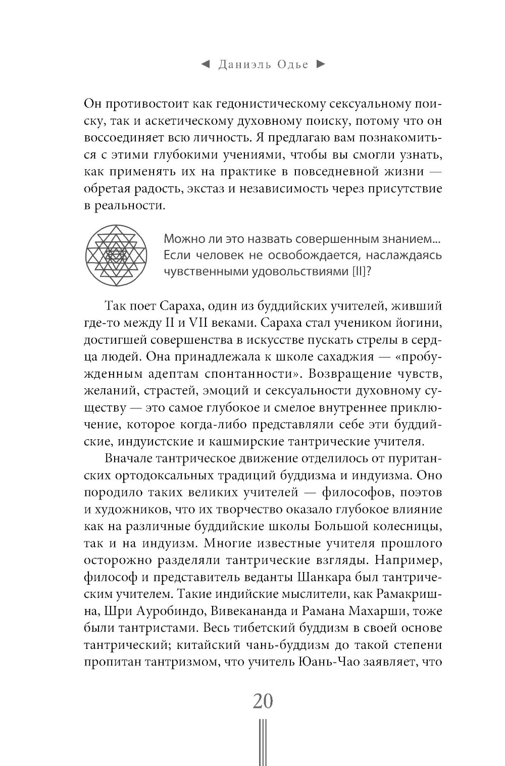 В течение тысячелетий последователи тантризма использовали силу страсти как средство для достижения вершин мистического познания. А энергию, порождаемую ею, - для поддержания внутреннего огня, сжигающего эгоистические представления ума, и для соединения с божественным началом. В своей книге Даниэль Одье исследует техники тантры, которые позволяют нам воздействовать на свой организм, управляя дыханием, мышлением и потоками энергии. Ведь, согласно тантризму, чтобы прийти к глубокой осознанности, необходимо в первую очередь идеально настроить свое тело. Автор раскрывает многие из тайных практик, которые содержатся в главных тантристских трактатах, а также описывает важные техники сексуального ритуала, известного как майтхуна. Тантризм - путь без страха и табу, объединяющий весь человеческий опыт с радостью, удовольствием, любовью и полнотой жизни.