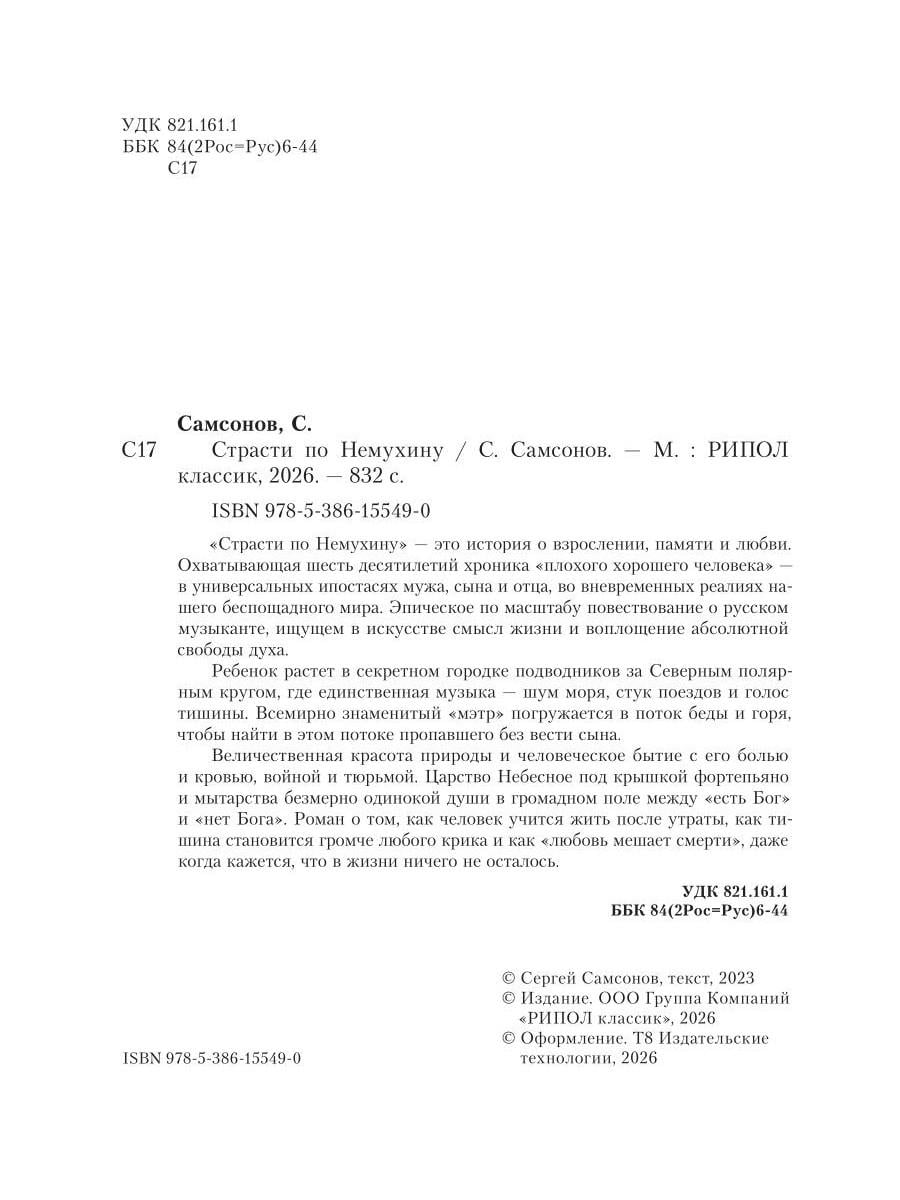 НЕЗАКОННОЕ ПОТРЕБЛЕНИЕ НАРКОТИЧЕСКИХ СРЕДСТВ, ПСИХОТРОПНЫХ ВЕЩЕСТВ, ИХ АНАЛОГОВ ПРИЧИНЯЕТ ВРЕД ЗДОРОВЬЮ, ИХ НЕЗАКОННЫЙ ОБОРОТ ЗАПРЕЩЕН И ВЛЕЧЕТ УСТАНОВЛЕННУЮ ЗАКОНОДАТЕЛЬСТВОМ ОТВЕТСТВЕННОСТЬ. Главный герой романа музыкант Матвей Немухин ищет Бога под крышкой рояля и не может разделаться с чертом в своей же собственной душе. Он живет между двух полюсов - тишиной, над которой «летит дыхание Святого Духа», и нашим беспощадным миром, где человеку с неизбежностью приходится терять любимых людей, страдать, болеть и умирать. Его жизнь - это узел, где сладость свободы переплелась с непоправимой виной перед ближними, а верность любви с предательством и горечью утраты. Он - тот «плохой хороший человек», в чьих мыслях и поступках каждый может узнать себя самого: мужа, сына, отца и прежде всего существо с душою и совестью. ПРОНЗИТЕЛЬНАЯ ПОЭТИЧНАЯ ИСТОРИЯ О ДАРЕ ЖИЗНИ ВО ВСЕЙ ЕЕ ВЕЛИКОЙ КРАСОТЕ, ТРАГИЧНОСТИ И ВЕЧНОЙ НЕРАЗГАДАННОСТИ. О ТОМ, КАК МУЗЫКА СПАСАЕТ ОТ ОТЧАЯНИЯ, А «ЛЮБОВЬ МЕШАЕТ СМЕРТИ». Сергей Самсонов - один из главных литературных голосов поколения. Лауреат многих крупнейших премий современной России, автор, чья проза заставляет проживать реальность на разрыв, а каждая новая книга становится событием. Его романы - это психологическая глубина, живой русский язык и та честность, которую ищет сегодняшний читатель.| Издательство | Рипол Классик |