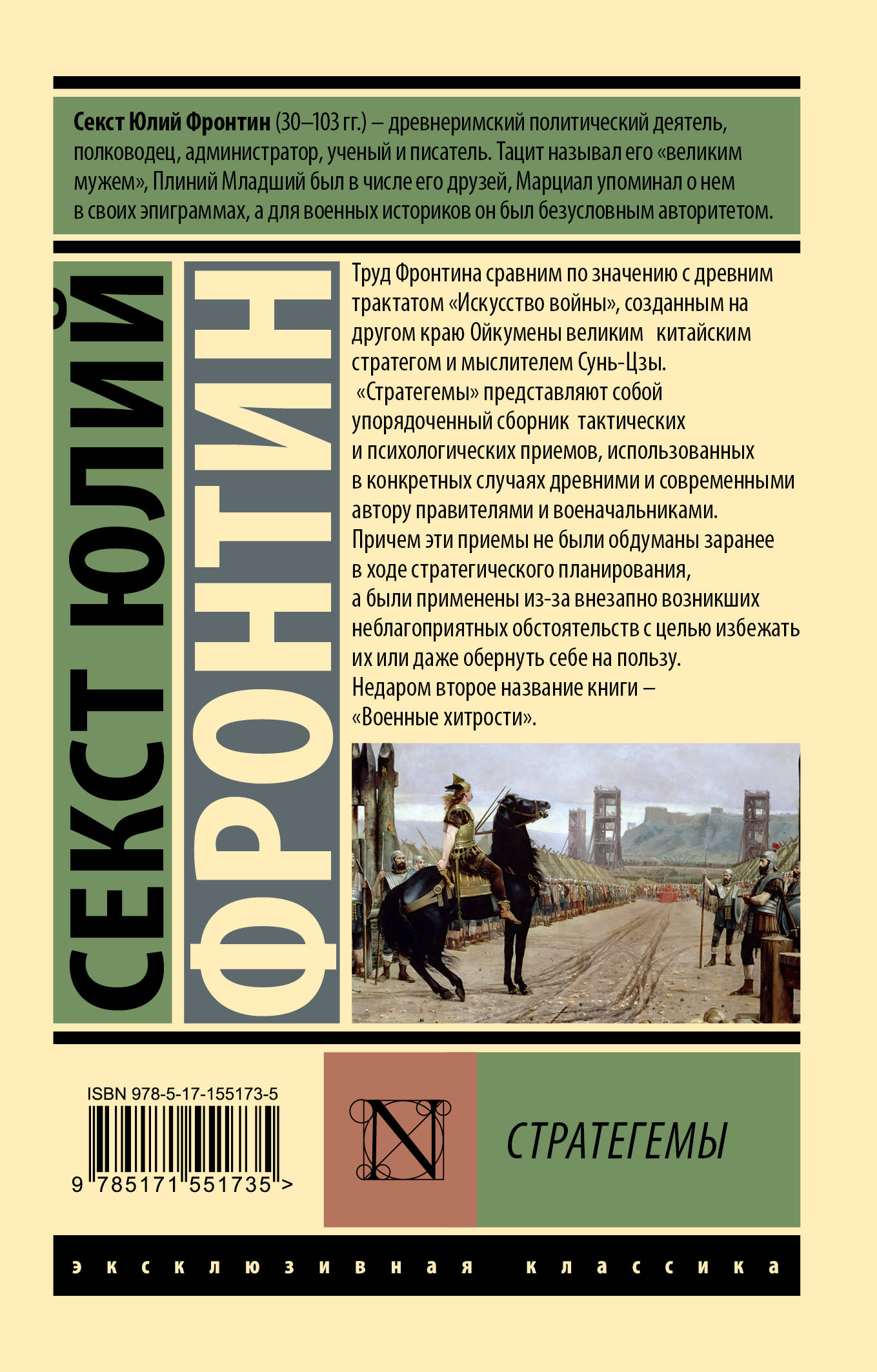 Секст Юлий Фронтин (30-103 гг.) - древнеримский политический деятель, полководец, администратор, ученый и писатель. Тацит называл его "великим мужем", Плиний Младший был в числе его друзей, Марциал упоминал о нем в своих эпиграммах, а для военных историков он был безусловным авторитетом. Труд Фронтина сравним по значению с древним трактатом "Искусство войны", созданным на другом краю Ойкумены великим китайским стратегом и мыслителем Сунь-Цзы. "Стратегемы" представляют собой упорядоченный сборник тактических и психологических приемов, использованных в конкретных случаях древними и современными автору правителями и военачальниками. Причем эти приемы не были обдуманы заранее в ходе стратегического планирования, а были применены из-за внезапно возникших неблагоприятных обстоятельств с целью избежать их или даже обернуть себе на пользу. Недаром второе название книги - "Военные хитрости".| Издательство | ИЗДАТЕЛЬСТВО "АСТ" |