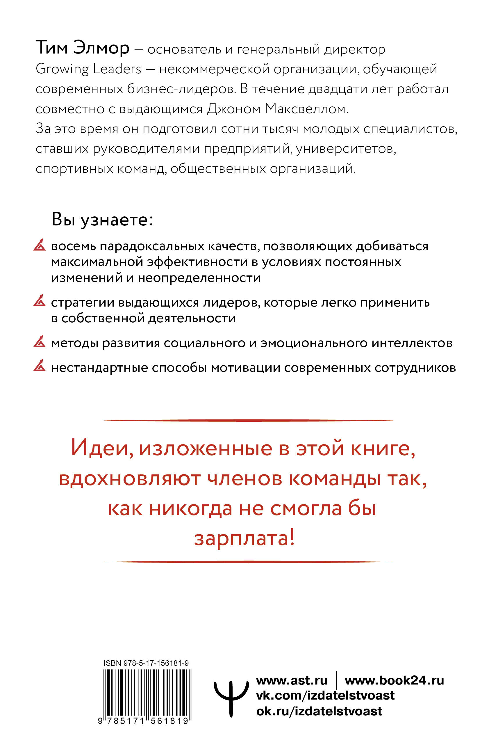 Забудьте все, что вы знали о законах лидерства, потому что мир изменился! Теперь, чтобы вдохновлять и мотивировать сотрудников, нужны совершенно другие качества и стратегии. Тим Элмор - мировой ТОП-эксперт по лидерству и личной эффективности, уровня Стивена Кови, Брайана Трейси, Джона Максвелла. Он написал более 30 руководств, которые изучают во всем мире. За 20 лет он подготовил сотни тысяч специалистов, ставших руководителями компаний, корпораций, фондов. Элмор вывел формулу эффективности для современных лидеров: всего восемь парадоксальных качеств, развив которые, вы станете более уверенным и компетентным руководителем. Его советы будут полезны как управленцам с большим опытом, так и новичкам, даже если пока вы руководите одним сотрудником. А также: педагогам, тренерам, коучам и даже родителям! Вы узнаете: • восемь парадоксальных качеств, которые гарантируют успех в управлении людьми; • стратегии мышления и поведения выдающихся лидеров современности; • способы разрешения и предотвращения конфликтов в команде; • секреты управления сотрудниками молодого поколения и смешанными по возрасту коллективами; • ключи к личному и профессиональному развитию.| Издательство | ИЗДАТЕЛЬСТВО "АСТ" |