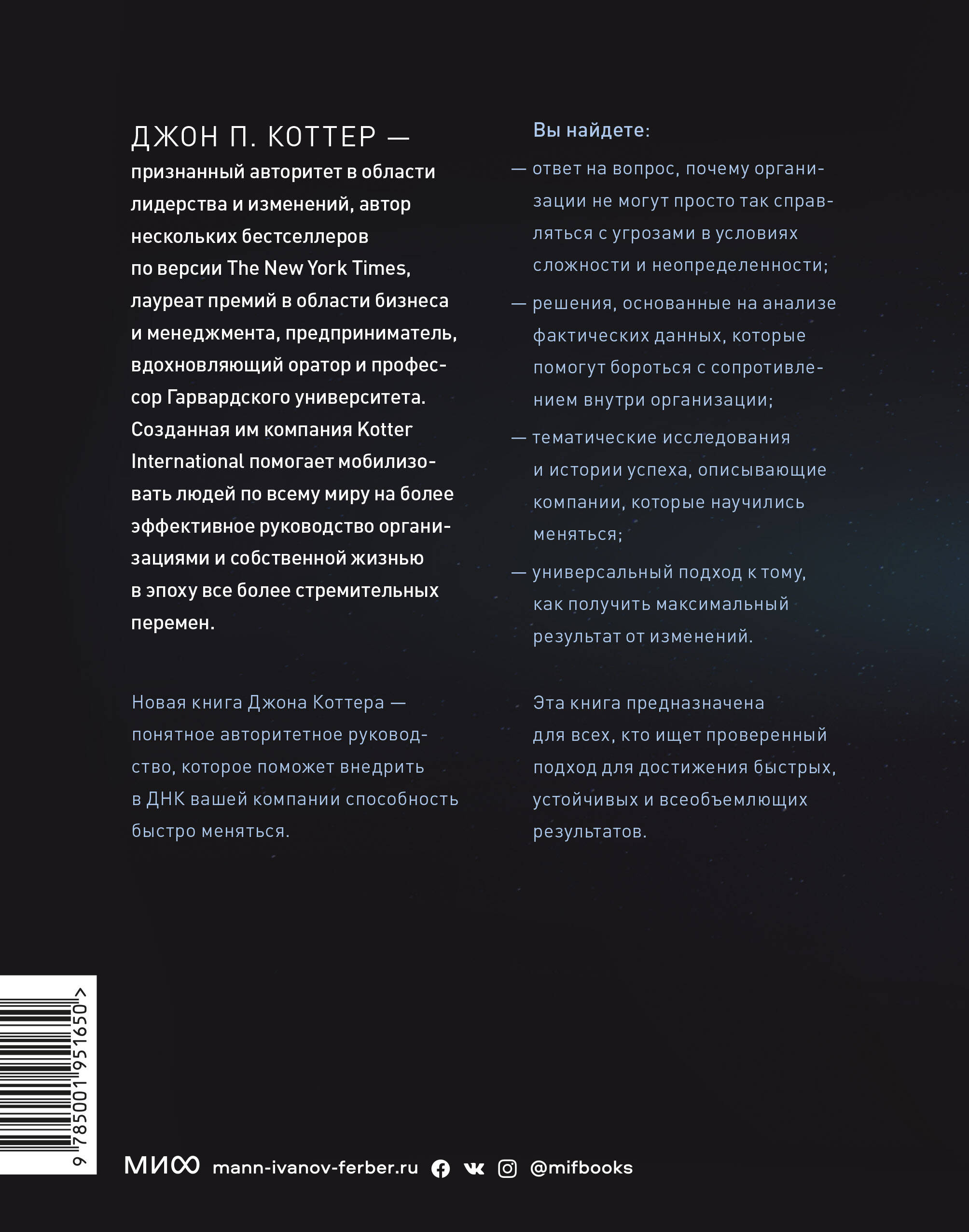 Стратегии, которые помогут руководителю быстро и эффективно преобразовать свою организацию в условиях нестабильности и неопределенности. Перемены - это основа современной реальности. Задача руководителя сегодня не может сводиться лишь к постепенному развитию своей компании. Сейчас жизненно важно создавать организации, которые способны быстро адаптироваться к условиям постоянно меняющейся среды. Новая книга Джона Коттера - понятное авторитетное руководство, которое поможет внедрить в ДНК вашей компании способность быстро меняться. Вы найдете: ответ на вопрос, почему организации не могут просто так справляться с угрозами в условиях сложности и неопределенности; решения, основанные на анализе фактических данных, которые помогут бороться с сопротивлением внутри организации; тематические исследования и истории успеха, описывающие организации, которые научились меняться; универсальный подход к тому, как получить максимальный результат от изменений. Для кого эта книга: Для бизнесменов, которые хотят преуспеть в эпоху постоянных перемен. Для предпринимателей, которые хотят улучшить и укрепить свои тактики ведения бизнеса.| Издательство | Манн, Иванов и Фербер |