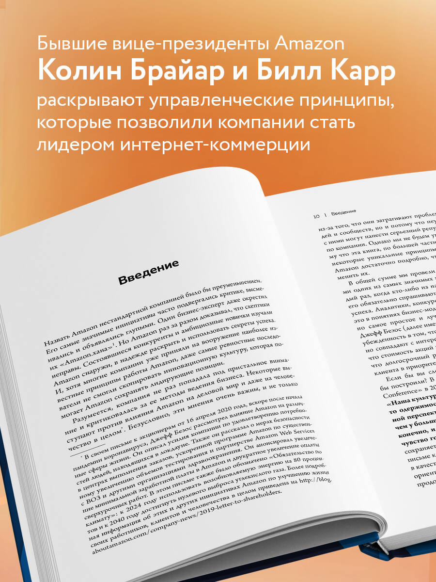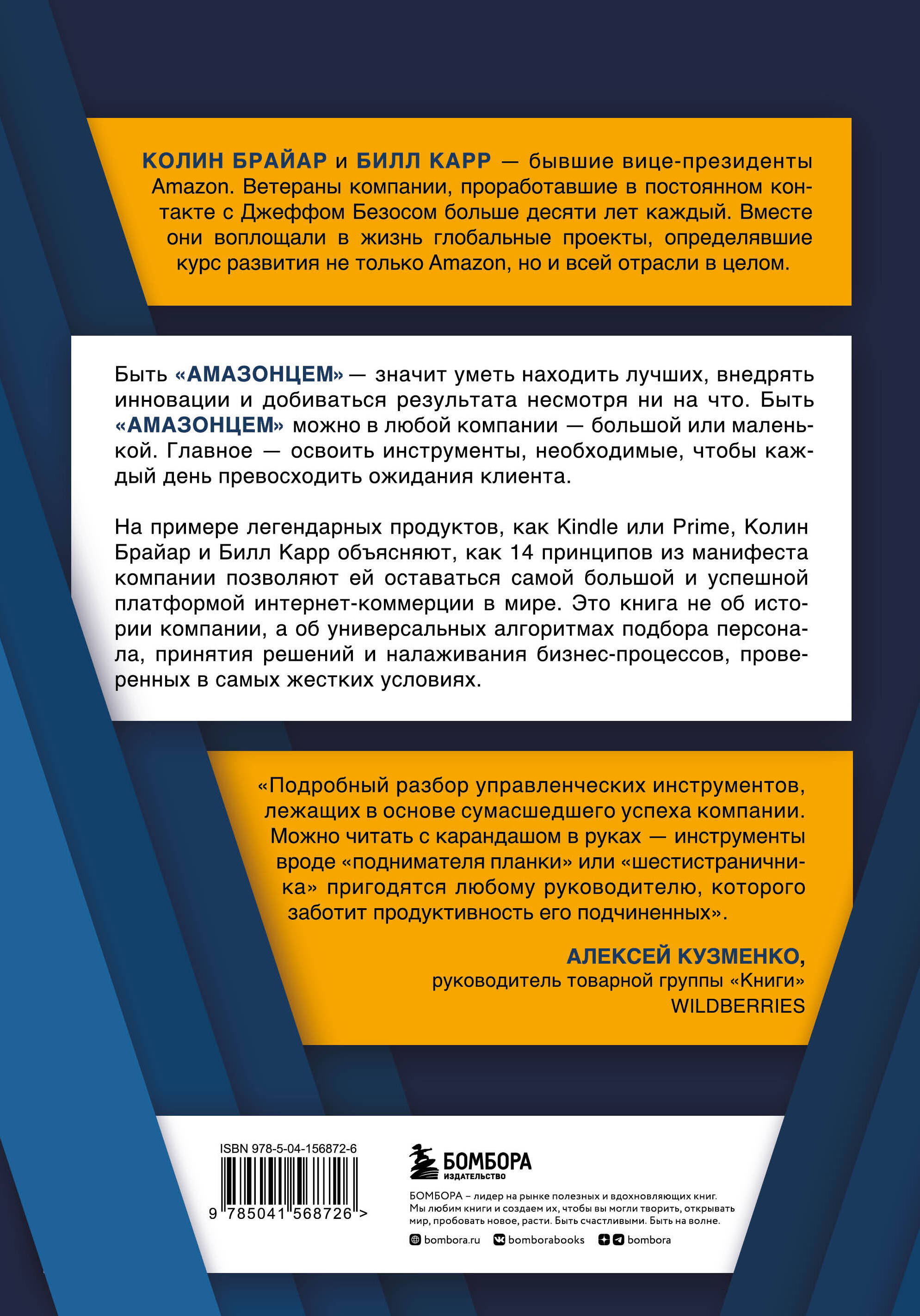 Быть «АМАЗОНЦЕМ» - значит, уметь находить лучших, внедрять инновации и добиваться результата, несмотря ни на что. Быть «АМАЗОНЦЕМ» можно в любой компании - большой или маленькой. Главное - освоить инструменты, необходимые, чтобы каждый день превосходить ожидания клиента. На примере легендарных продуктов, таких как Kindle или Prime, Колин и Билл объясняют, как 14 принципов из манифеста компании позволяют ей оставаться самой большой и успешной платформой интернет-коммерции в мире. Это книга не об истории компании, а об универсальных алгоритмах подбора персонала, принятия решений и налаживания бизнес-процессов, проверенных в самых жестких условиях. ОБ АВТОРАХ Колин Брайар и Билл Карр - бывшие вице-президенты Amazon. Ветераны компании, проработавшие в постоянном контакте с Джеффом Безосом больше десяти лет каждый. Вместе они воплощали в жизнь глобальные проекты, определявшие курс развития не только Amazon, но и всей отрасли в целом. ОТЗЫВЫ «Подробный разбор управленческих инструментов, лежащих в основе сумасшедшего успеха компании. Можно читать с карандашом в руках - инструменты вроде "поднимателя планки" или "шестистраничника" пригодятся любому руководителю, которого заботит продуктивность его подчиненных». - Алексей Кузменко, руководитель товарной группы «Книги» Wildberries «В этой книге Колин и Брайан дают нам возможность посмотреть на работу Amazon изнутри, причем в период сумасшедшего, бурного роста. Поскольку я был партнером Amazon и во время работы в Red Hat и в IBM, я могу подтвердить безоговорочную преданность этой компании своим клиентам. Руководители, которые хотят, чтобы их команды были так же одержимы покупателями, а организация добилась операционного превосходства, обязаны прочитать эту книгу». - Джим Вайтхерст, бывший президент IBM| Издательство | ООО "Издательство "Эксмо" |