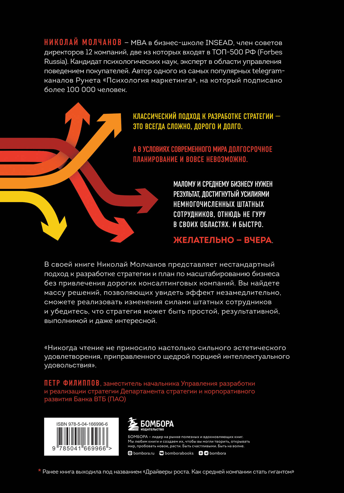 Николай Молчанов - MBA в бизнес-школе INSEAD, член советов директоров 12 компаний, две из которых входят в ТОП-500 РФ (Forbes Russia). Кандидат психологических наук, эксперт в области управления поведением покупателей. Автор одного из самых популярных telegram-каналов Рунета «Психология маркетинга», на который подписано более 100 000 человек. Классический подход к разработке стратегии - это всегда сложно, дорого и долго. А в условиях современного мира долгосрочное планирование и вовсе невозможно. Малому и среднему бизнесу нужен результат, достигнутый усилиями немногочисленных штатных сотрудников, отнюдь не гуру в своих областях. И быстро. Желательно - вчера. В своей книге Николай Молчанов представляет нестандартный подход к разработке стратегии и план по масштабированию бизнеса без привлечения дорогих консалтинговых компаний. Вы найдете массу решений, позволяющих увидеть эффект незамедлительно, сможете реализовать изменения силами штатных сотрудников и убедитесь, что стратегия может быть простой, результативной, выполнимой и даже интересной. «Никогда чтение не приносило настолько сильного эстетического удовлетворения, приправленного щедрой порцией интеллектуального удовольствия». - Петр Филиппов, Заместитель начальника Управления разработки и реализации стратегии Департамента стратегии и корпоративного развития Банка ВТБ (ПАО) Ранее книга выходила под названием «Драйверы роста. Как средней компании стать гигантом».| Издательство | Эксмо |