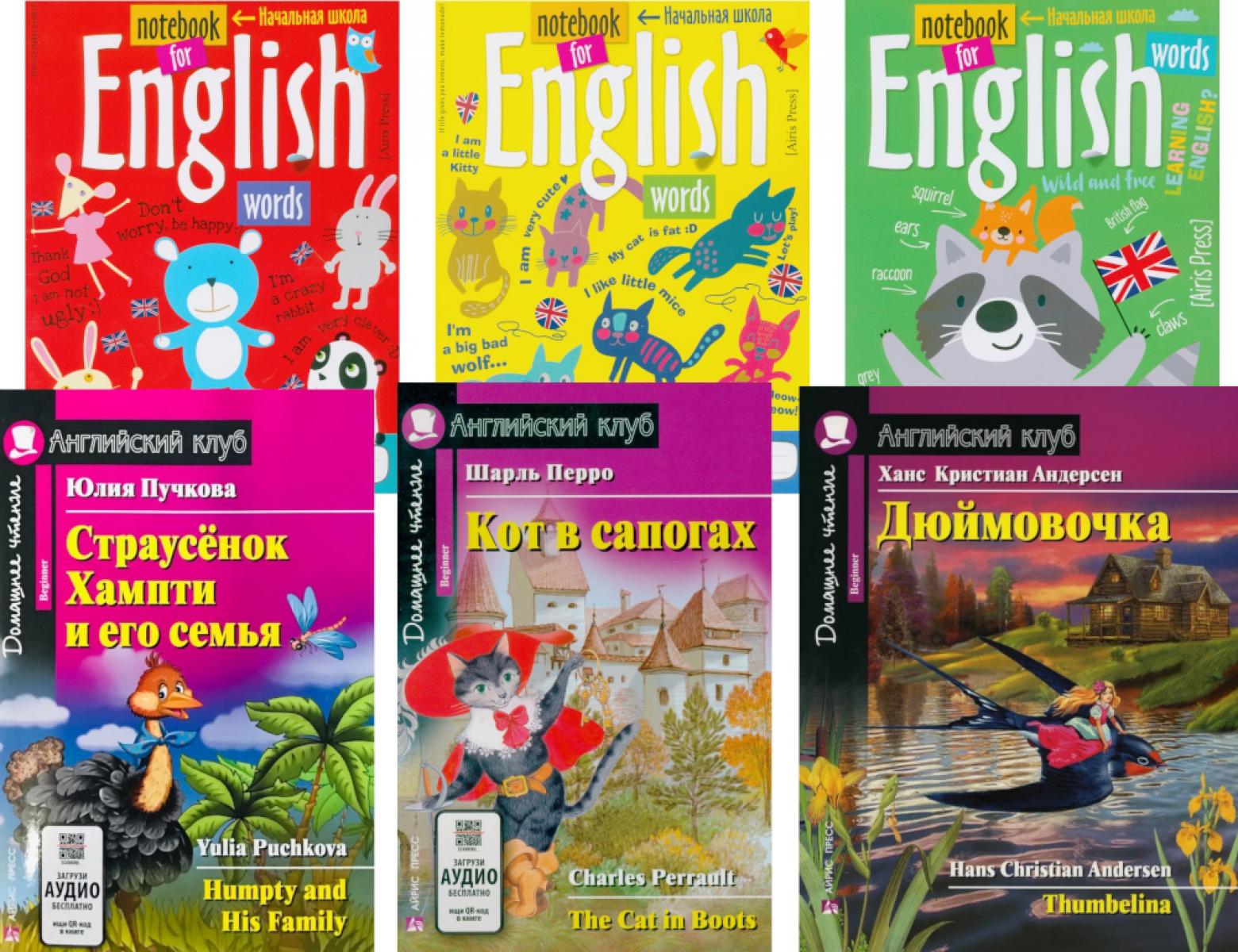 В комплект вошли три тетради для записи английских слов и три книги уровня Beginner на английском языке: «Страусенок Хампти и его семья» Эта книга - сборник забавных историй о жизни семьи страусов, поведанных самым старшим из страусят. Жизнь африканских страусят одновременно полна опасностей и курьёзов. Во всех ситуациях их спасает находчивость, самоотверженность и преданность друг другу. Каждая глава снабжена упражнениями, направленными на развитие навыков речи и отработку грамматики. Пособие адресовано учащимся 3-4 классов школ, лицеев и гимназий. Книга содержит англо-русский словарь, соответствующий данному этапу обучения. «Кот в сапогах» Книга представляет собой пересказ знаменитой сказки французского писателя Шарля Перро «Кот в сапогах» на английском языке. Главный герой сказки - отважный и предприимчивый кот, который помогает своему хозяину достичь успеха и благополучия и завоевать сердце прекрасной принцессы. Текст пособия адаптирован в учебных целях до уровня Веginnег. Каждая глава сопровождается переводом новых слов и трудных выражений, а также упражнениями, направленными на проверку понимания текста, расширение лексического запаса, отработку грамматических конструкций и развитие навыков устной речи. В конце книги помещен англо-русский словарь. Пособие адресовано учащимся 3-4 классов школ, гимназий и лицеев. «Дюймовочка» Книга представляет собой адаптацию сказки великого датского писателя Ханса Кристиана Андерсена (1805-1875) «Дюймовочка» на английском языке. Это одна из лучших сказок знаменитого писателя, широко известная в нашей стране. Она сразу пришлась по душе не только детям, но и взрослым. В ней рассказывается о маленькой, красивой и доброй девочке, появившейся на свет из цветка. Данное пособие разработано в соответствии с новыми требованиями Федерального государственного образовательного стандарта (ФГОС). После каждой главы пособия следуют комментарий и перевод трудных слов и выражений, а также упражнения, которые учитывают новые требования итоговой аттестации. Они направлены не только на проверку понимания текста, но и на отработку лексики, грамматики, а также развитие умений чтения, аудирования, устной речи, письма.| Издательство | Айрис-Пресс |