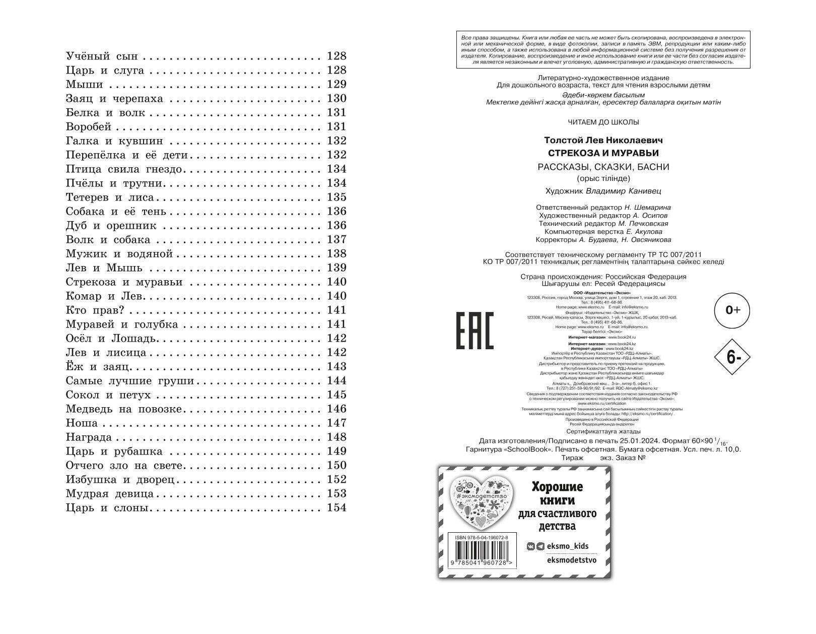 Сборник «Стрекоза и муравьи. Рассказы, сказки, басни» Л. Толстого представлен в серии «Читаем до школы». Это подборка главных произведений русских и зарубежных авторов, рекомендованных для дошкольного обучения. Книга содержит такие известные истории, как «Филипок», «Лев и мышь», «Косточка» и другие. На страницах вы встретите замечательные иллюстрации российского художника Владимира Канивца. Кроме того, серия «Читаем до школы» составляет единый цикл с такими изданиями, как «Книги для внеклассного чтения» и «Читаем по школьной программе». Эта серия рассчитана на детей-дошколят, на их яркое воображение, любознательные умы и хорошее настроение.| Издательство | ООО "Издательство "Эксмо" |