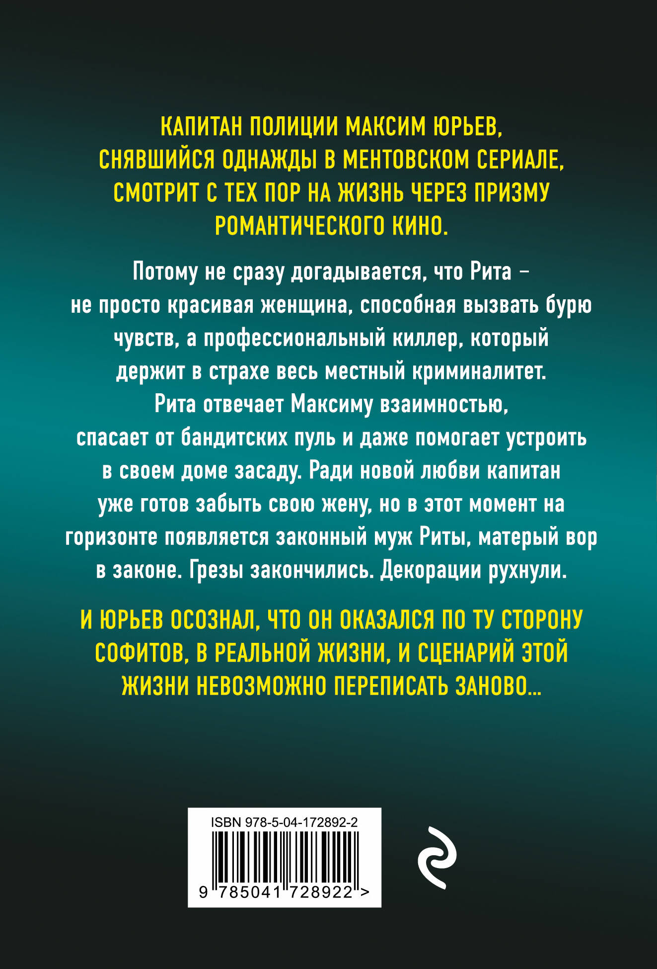 Капитан полиции Максим Юрьев, снявшийся однажды в ментовском сериале, смотрит с тех пор на жизнь через призму романтического кино. Потому не сразу догадывается, что Рита - не просто красивая женщина, способная вызвать бурю чувств, а профессиональный киллер, который держит в страхе весь местный криминалитет. Рита отвечает Максиму взаимностью, спасает от бандитских пуль и даже помогает устроить в своем доме засаду. Ради новой любви капитан уже готов забыть свою жену, но в этот момент на горизонте появляется законный муж Риты, матерый вор в законе. Грезы закончились. Декорации рухнули. И Юрьев осознал, что он оказался по ту сторону софитов, в реальной жизни, и сценарий этой жизни невозможно переписать заново…| Издательство | ООО "Издательство "Эксмо" |