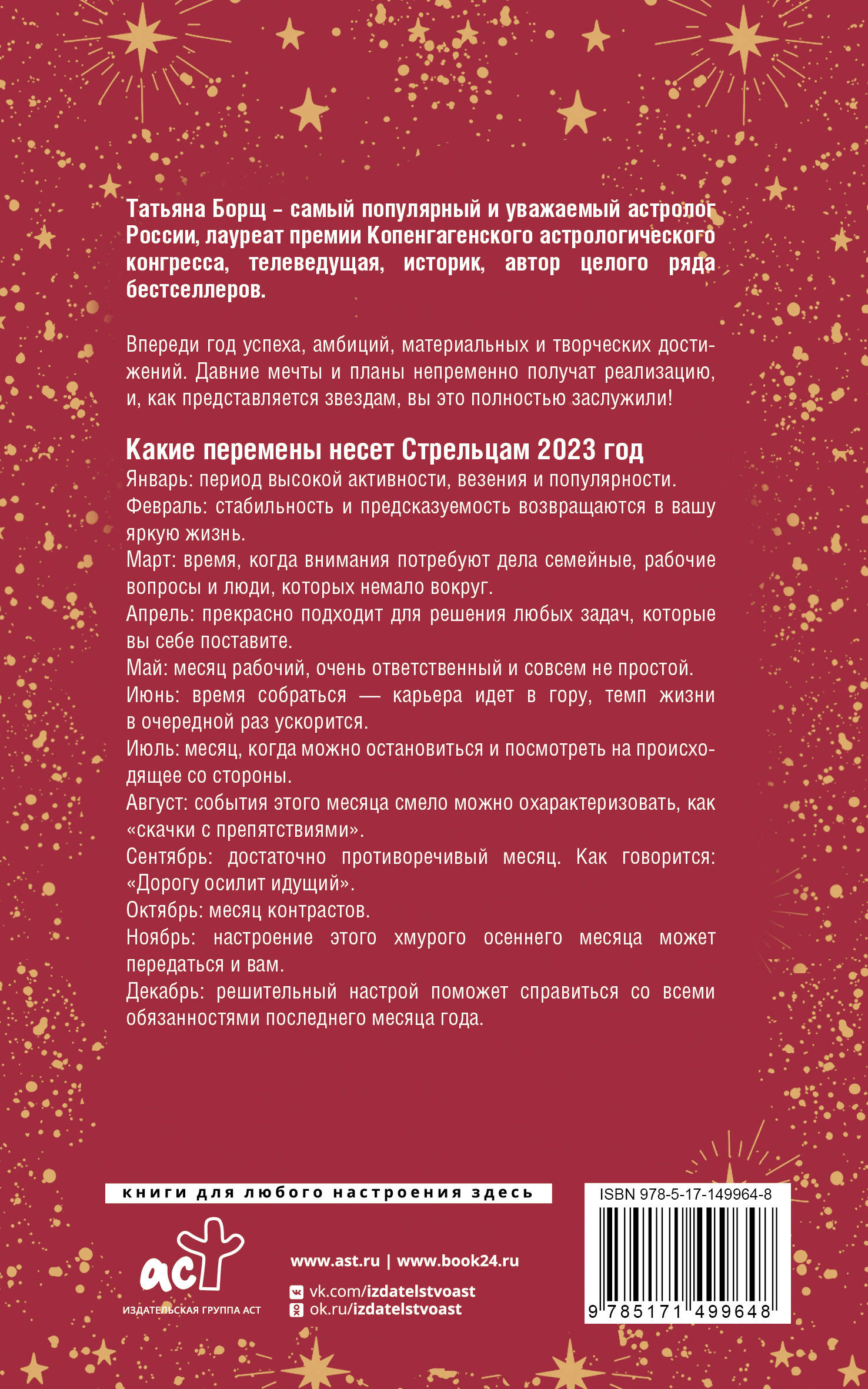 Гороскопы на 2023 год для каждого знака зодиака от одного из самых популярных и уважаемых астрологов России Татьяны Борщ. Календари серии расскажут, что ждет вас в сфере работы, личной жизни, семьи и творческой реализации в каждый из месяцев нового года. Вы сможете заведомо подготовиться к непростым периодам и получить четкие рекомендации, которые помогут навести порядок в жизни вопреки неудачному расположению планет.| Издательство | АСТ |