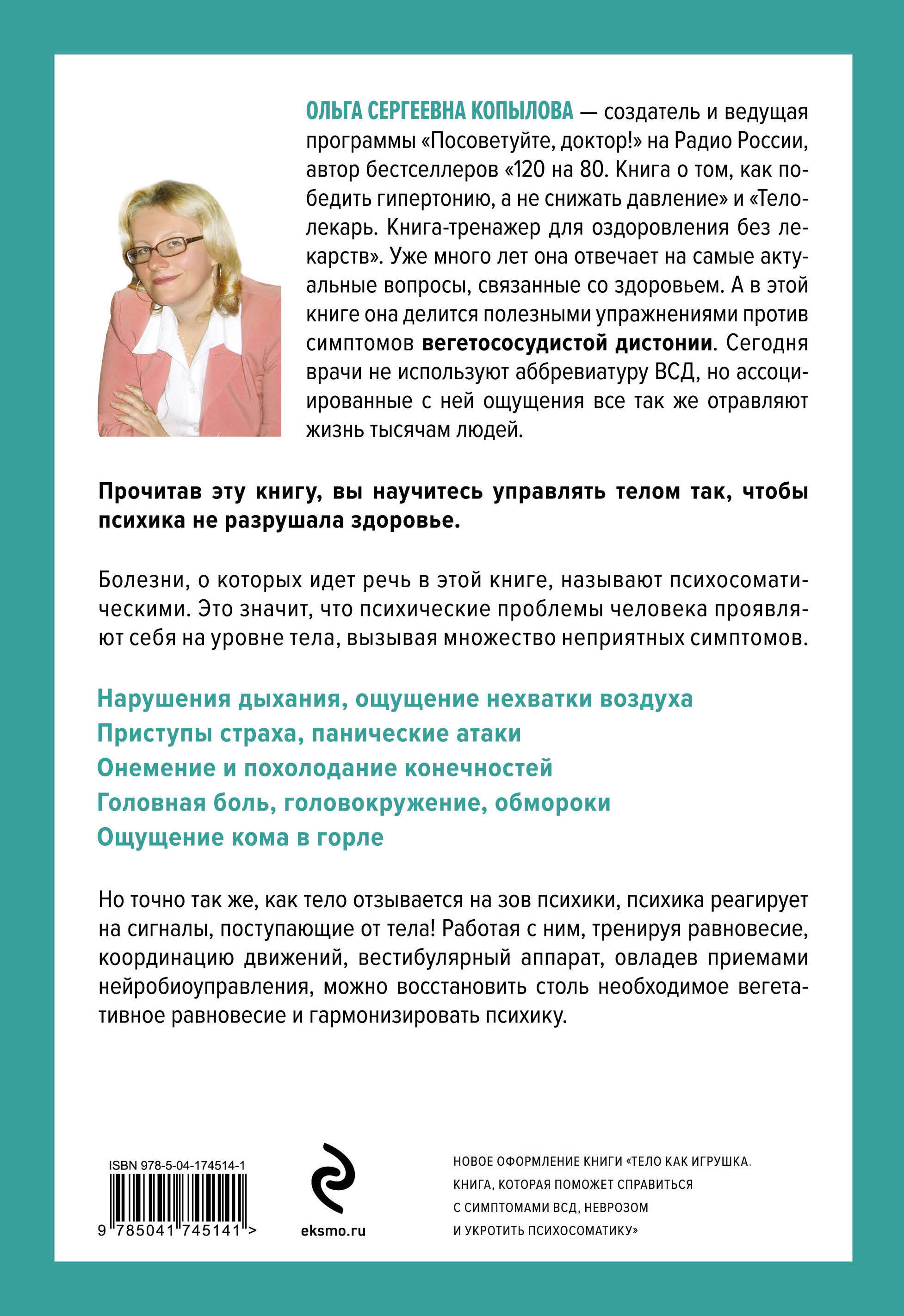 Эта книга объясняет механизмы возникновения психосоматических заболеваний и рассказывает, какие системы организма и как затрагивает психосоматика. Что на самом деле кроется за диагнозом-фантомом вегетососудистая дистония? Каким образом можно приручить психосоматику или хотя бы договориться с ней? Внутри вы найдете конкретные рекомендации и методики от профессиональных врачей, которые помогут в тренировке вегетативной системы организма и борьбе с приступами паники и перевозбуждением нервной системы. Для кого эта книга? - Для тех, кого интересуют скрытые возможности психики человека и феномен психосоматических заболеваний. - Для тех, кто неважно чувствует себя даже при безупречных анализах и не может найти причины плохого состояния здоровья. - Для тех, кто услышал от врача диагноз вегетососудистая дистония и хочет выяснить, что на самом деле скрывает эта формулировка. - Для тех, кто хочет повысить стрессоустойчивость и возможности своего организма, подкорректировав образ жизни. - Для тех, кто ищет конкретные упражнения, помогающие бороться с приступами паники и перевозбуждением нервной системы.| Издательство | ООО "Издательство "Эксмо" |