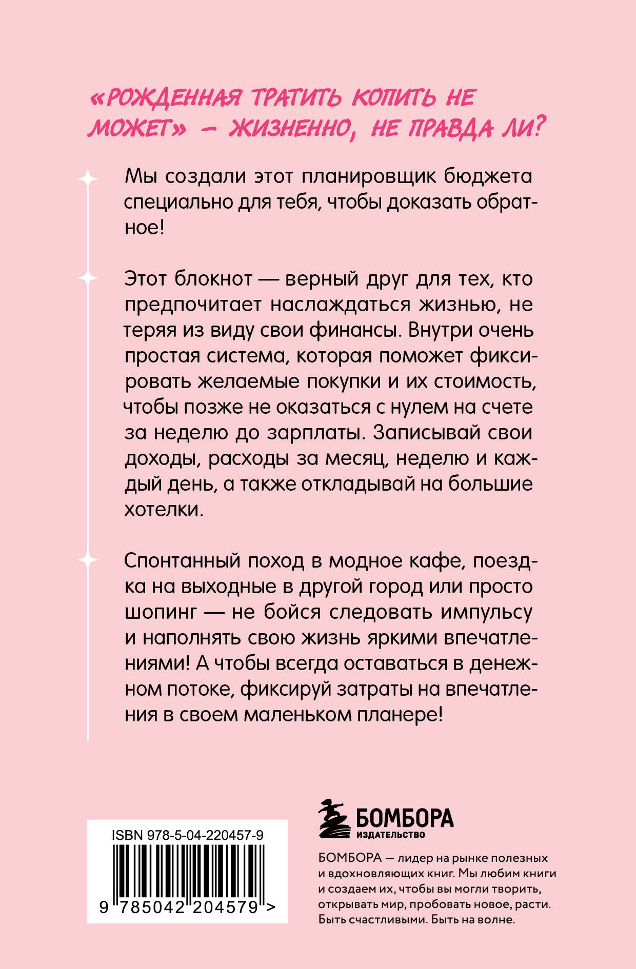 Кто сказал, что исполнять свои мечты можно только путем строгой экономии и нудного наполнения копилки монетками? Забудь об этом! Деньги должны приносить удовольствие, и чтобы их всегда на это удовольствие хватало, мы придумали планировщик бюджета, который тебя по-настоящему понимает! Этот уникальный блокнот - верный друг для тех, кто хочет не просто копить, а жить ярко, тратя деньги осознанно и без лишнего стресса. Внутри нет жестких правил и сложной системы - можно заполнять все разделы или только те, что тебе удобны. Главное - найти баланс между экономией и удовольствием. Чем еще крут этот блокнот? - внутри множество страничек с остроумными мемами и мыслями, вдохновляющих на маленькие радости; - можно заполнять виш-листы каждый месяц и медленно, но верно идти к своим мечтам; - суперстильное оформление, которое так и хочется показать друзьям в соцсетях; - миниатюрный формат А6, который удобно носить с собой повсюду. Спонтанный поход в модное кафе, поездка на выходные в другой город или просто шопинг - не бойся следовать импульсу и наполнять свою жизнь яркими впечатлениями! А чтобы всегда оставаться в денежном потоке, фиксируй затраты на впечатления в планировщике!| Издательство | ООО "Издательство "Эксмо" |