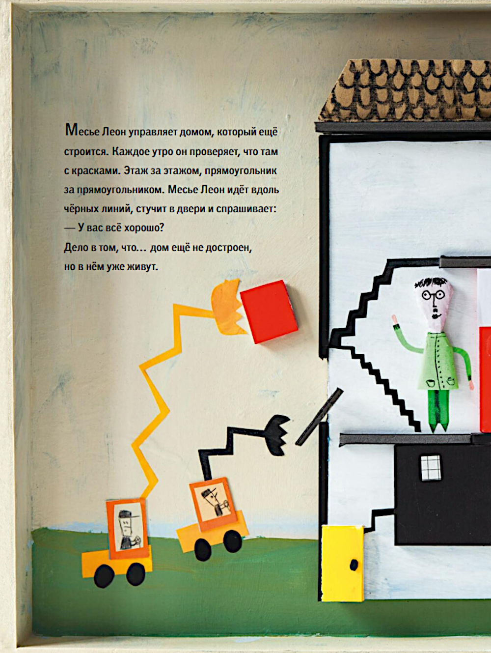 Месье Леон управляет домом, который ещё строится. Каждое утро он проверяет, что там с красками. Этаж за этажом, прямоугольник за прямоугольником. Месье Леон идёт вдоль чёрных линий, стучит в двери и спрашивает: - У вас всё хорошо? Дело в том, что... дом ещё не достроен, но в нём уже живут. На создание этой истории автора и художника вдохновила картина Пита Мондриана «Композиция с большой красной плоскостью, жёлтым, чёрным, серым и синим».| Издательство | Поляндрия Принт |