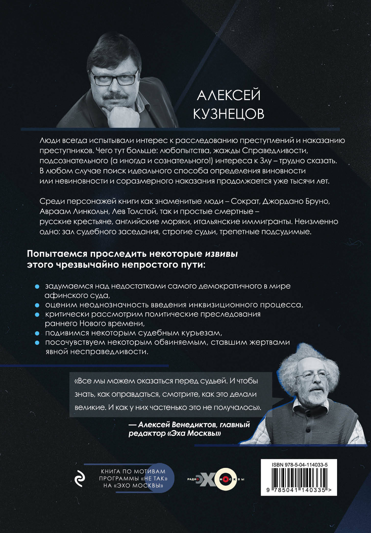 Алексей Венедиктов: «Все мы можем оказаться перед судьей. И чтобы знать, как оправдаться, смотрите, как это делали великие. И как у них частенько это не получалось». 50 самых громких и интересных судебных процессов прошлого. Среди персонажей книги как знаменитые люди - Сократ, Джордано Бруно, Авраам Линкольн, Лев Толстой, так и простые смертные - русские крестьяне, английские моряки, итальянские иммигранты. Неизменно одно: зал судебного заседания, строгие судьи, трепетные подсудимые. Книга по мотивам программы «Не так» на «ЭХО Москвы».| Издательство | ООО "Издательство "Эксмо" |
