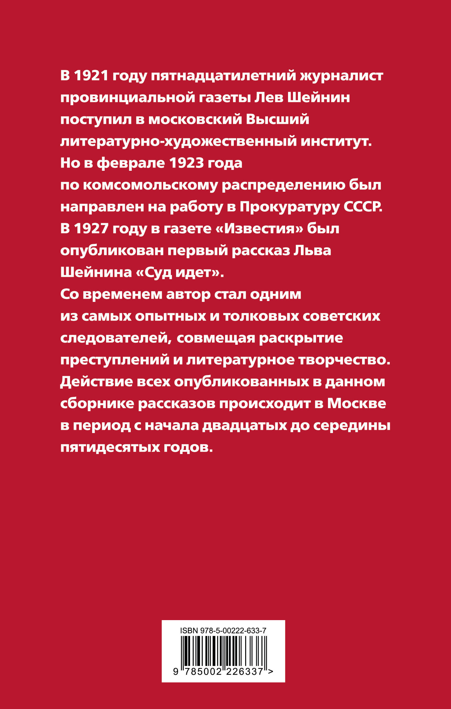 В 1921 году пятнадцатилетний журналист провинциальной газеты Лев Шейнин поступил в московский Высший литературно-художественный институт. Но в феврале 1923 года по комсомольскому распределению был направлен на работу в Прокуратуру СССР. В 1927 году в газете «Известия» был опубликован первый рассказ Льва Шейнина «Суд идет». Со временем автор стал одним из самых опытных и толковых советских следователей, совмещая раскрытие преступлений и литературное творчество. Действие всех опубликованных в данном сборнике рассказов происходит в Москве в период с начала двадцатых до середины пятидесятых годов.| Издательство | Родина Издательство ООО |