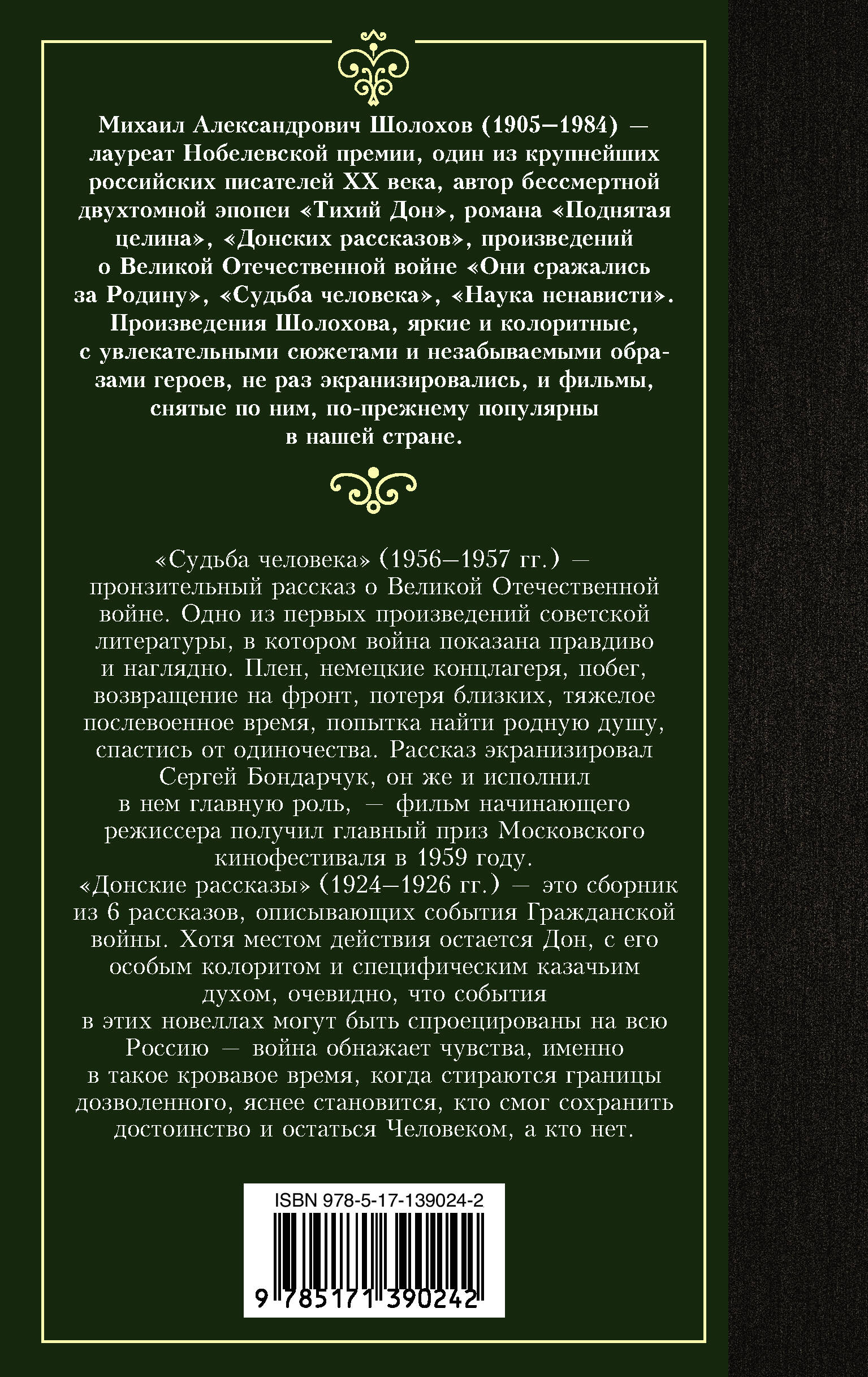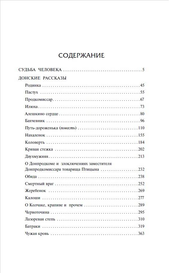 "Судьба человека" (1956-1957 гг.) - пронзительный рассказ о временах Великой Отечественной войны. Одно из первых произведений советской литературы, в котором война показана правдиво и наглядно. Плен, немецкие концлагеря, побег, возвращение на фронт, потеря близких, тяжелое послевоенное время, попытка найти родную душу, спастись от одиночества. Рассказ экранизировал Сергей Бондарчук, он же и исполнил в нем главную роль, - фильм начинающего режиссера получил главный приз Московского кинофестиваля в 1959 году. "Донские рассказы" (1924-1926 гг.) - это сборник из 6 рассказов, описывающих события Гражданской войны. Хотя местом действия остается Дон, с его особым колоритом и специфическим казачьим духом, очевидно, что события в этих новеллах могут быть спроецированы на всю Россию - война обнажает чувства, именно в такое кровавое время, когда стираются границы дозволенного, яснее становится, кто смог сохранить достоинство и остаться Человеком, а кто нет.| Издательство | ИЗДАТЕЛЬСТВО "АСТ" |