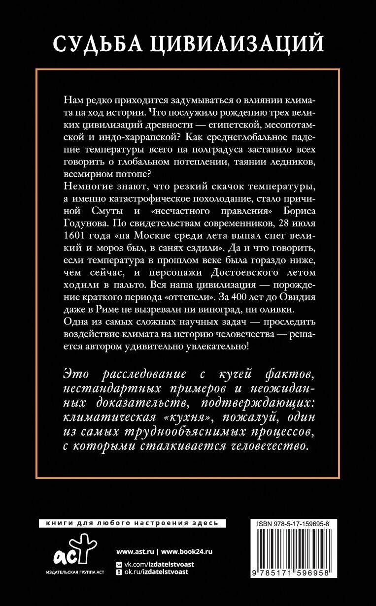 Нам редко приходится задумываться о влиянии климата на ход истории. Что послужило рождению трех великих цивилизаций древности - египетской, месопотамской и индо-харрапской? Как среднеглобальное падение температуры всего на полградуса заставило всех говорить о глобальном потеплении, таянии ледников, всемирном потопе? Немногие знают, что резкий скачок температуры, а именно катастрофическое похолодание, стало причиной Смуты и "несчастного правления" Бориса Годунова. По свидетельствам современников, 28 июля 1601 года "на Москве среди лета выпал снег великий и мороз был, в санях ездили". Да и что говорить, если температура в прошлом веке была гораздо ниже, чем сейчас, и персонажи Достоевского летом ходили в пальто. Вся наша цивилизация - порождение краткого периода "оттепели". За 400 лет до Овидия даже в Риме не вызревали ни виноград, ни оливки. Одна из самых сложных научных задач - проследить воздействие климата на историю человечества - решается автором удивительно увлекательно! Это расследование с кучей фактов, нестандартных примеров и неожиданных доказательств, подтверждающих: климатическая "кухня", пожалуй, один из самых труднообъяснимых процессов, с которыми сталкивается человечество.| Издательство | Издательство "АСТ" |