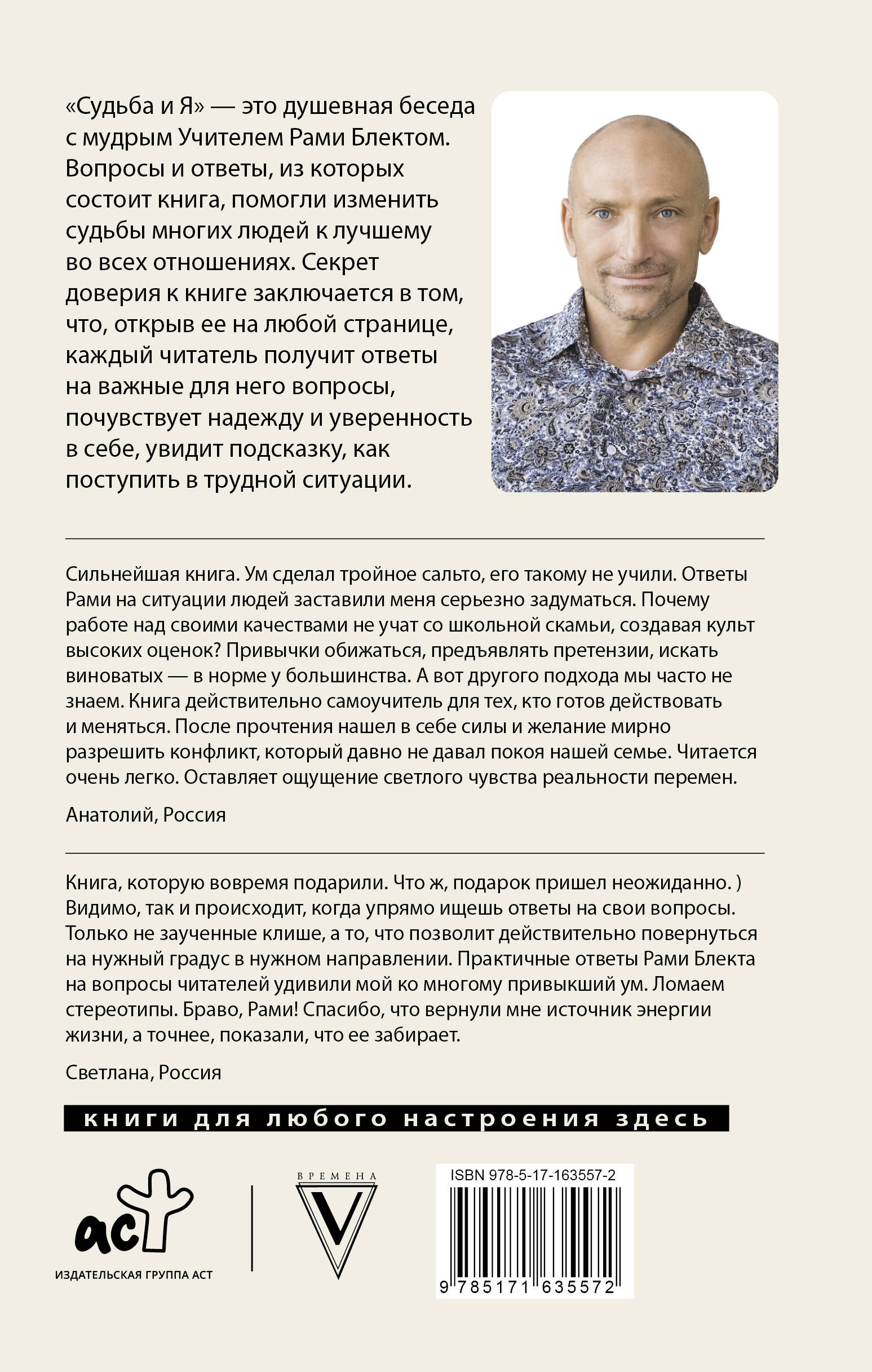 "Судьба и Я" - это душевная беседа с мудрым Учителем Рами Блектом. Вопросы и ответы, из которых состоит книга, помогли изменить судьбы многих людей к лучшему во всех отношениях. Секрет доверия к книге заключается в том, что, открыв ее на любой странице, каждый читатель получит ответы на важные для него вопросы, почувствует надежду и уверенность в себе, увидит подсказку, как поступить в трудной ситуации.