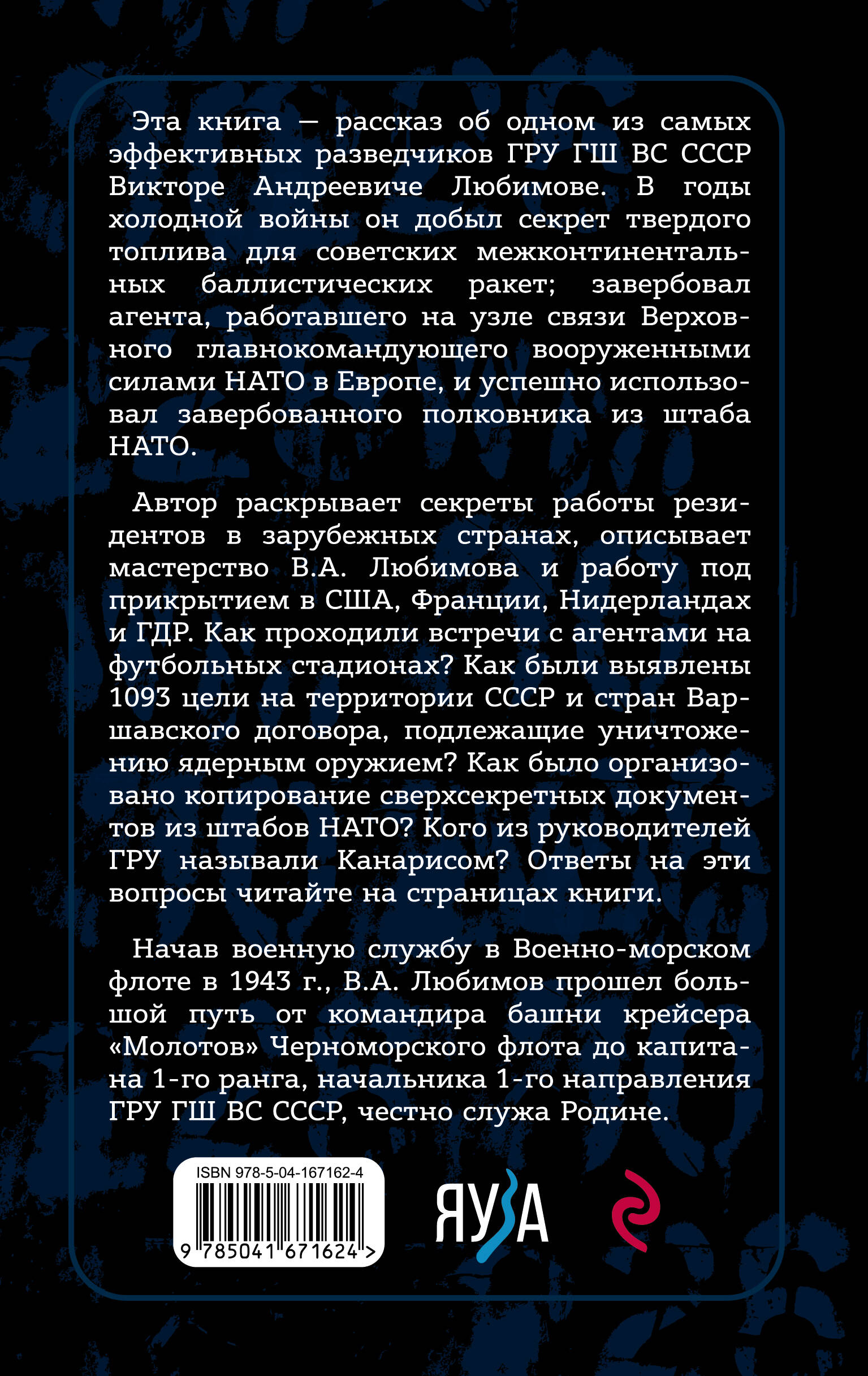 В 1970 г. на экраны Советского Союза вышел двухсерийный художественный фильм «Судьба резидента» о вражеском разведчике в СССР, а в то же время за пределами СССР успешно действовал резидент ГРУ В.А. Любимов. Деятельность разведчиков всегда засекречена, но новая книга Михаила Болтунова приоткрывает завесу тайны и показывает работу резидента ГРУ. Эта книга - рассказ об одном из самых эффективных разведчиков ГРУ ГШ ВС СССР Викторе Андреевиче Любимове. В годы «холодной войны» он добыл секрет твердого топлива для советских межконтинентальных баллистических ракет; завербовал агента, работавшего на узле связи Верховного главнокомандующего вооруженными силами НАТО в Европе, и успешно использовал завербованного полковника из штаба НАТО. Автор раскрывает секреты работы резидентов в зарубежных странах, описывает мастерство В.А. Любимова и работу под прикрытием в США, Франции, Нидерландах и ГДР. Как проходили встречи с агентами на футбольных стадионах? Как были выявлены 1093 цели на территории СССР и стран Варшавского договора, подлежащие уничтожению ядерным оружием? Как было организовано копирование сверхсекретных документов из штабов НАТО? Кого из руководителей ГРУ называли Канарисом? Ответы на эти вопросы читайте на страницах книги. Начав военную службу в Военно-морском флоте в 1943 г. В.А. Любимов прошел большой путь от командира башни крейсера «Молотов» Черноморского флота до капитана 1-го ранга, начальника 1-го направления ГРУ ГШ ВС СССР, честно служа Родине. «Систематически стали добываться агентурным путем секретные документы, освещающие деятельность основных органов НАТО. Большая заслуга в этом лично капитана I ранга Любимова». - Из доклада в Центр| Издательство | Эксмо |