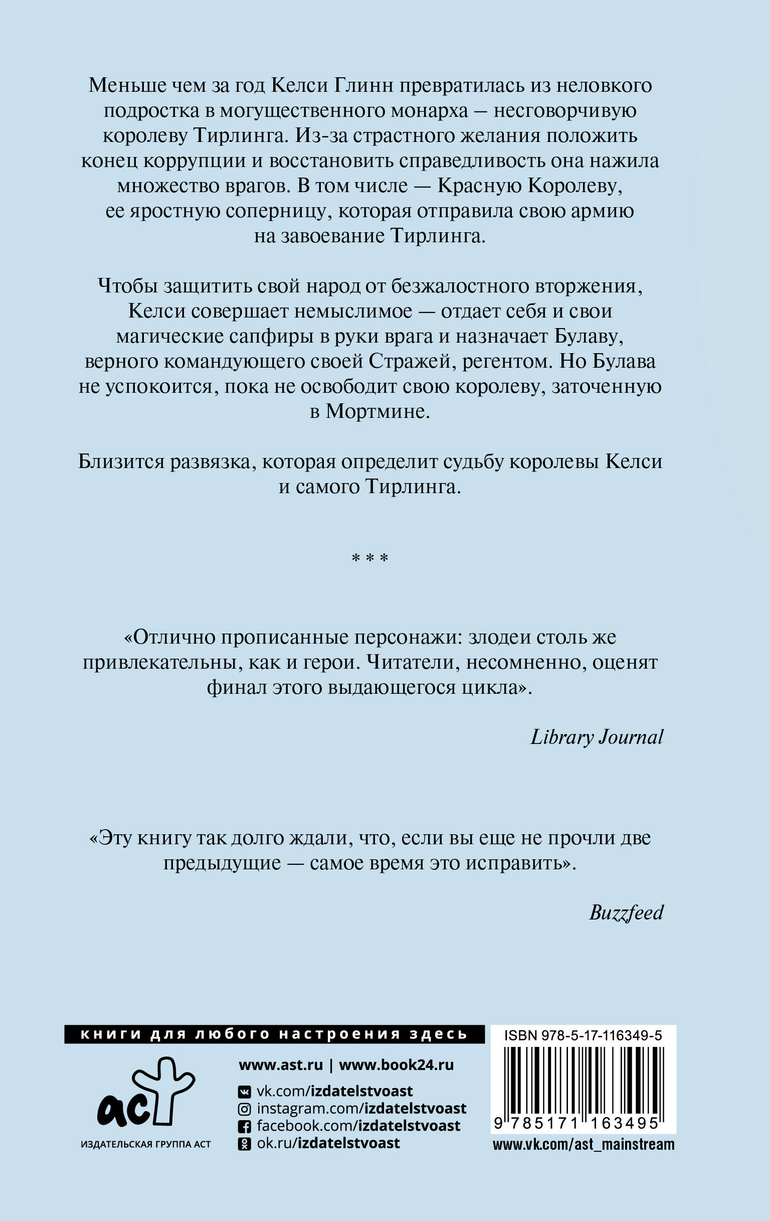 Меньше чем за год Келси Глинн превратилась из неловкого подростка в могущественного монарха - несговорчивую королеву Тирлинга. Из-за страстного желания положить конец коррупции и восстановить справедливость она нажила множество врагов. В том числе - Красную Королеву, ее яростную соперницу, которая отправила свою армию на завоевание Тирлинга. Чтобы защитить свой народ от безжалостного вторжения, Келси совершает немыслимое - отдает себя и свои магические сапфиры в руки врага и назначает Булаву, верного командующего своей Стражей, регентом. Но Булава не успокоится, пока не освободит свою королеву, заточенную в Мортмине. Близится развязка, которая определит судьбу королевы Келси и самого Тирлинга.| Издательство | ИЗДАТЕЛЬСТВО "АСТ" |