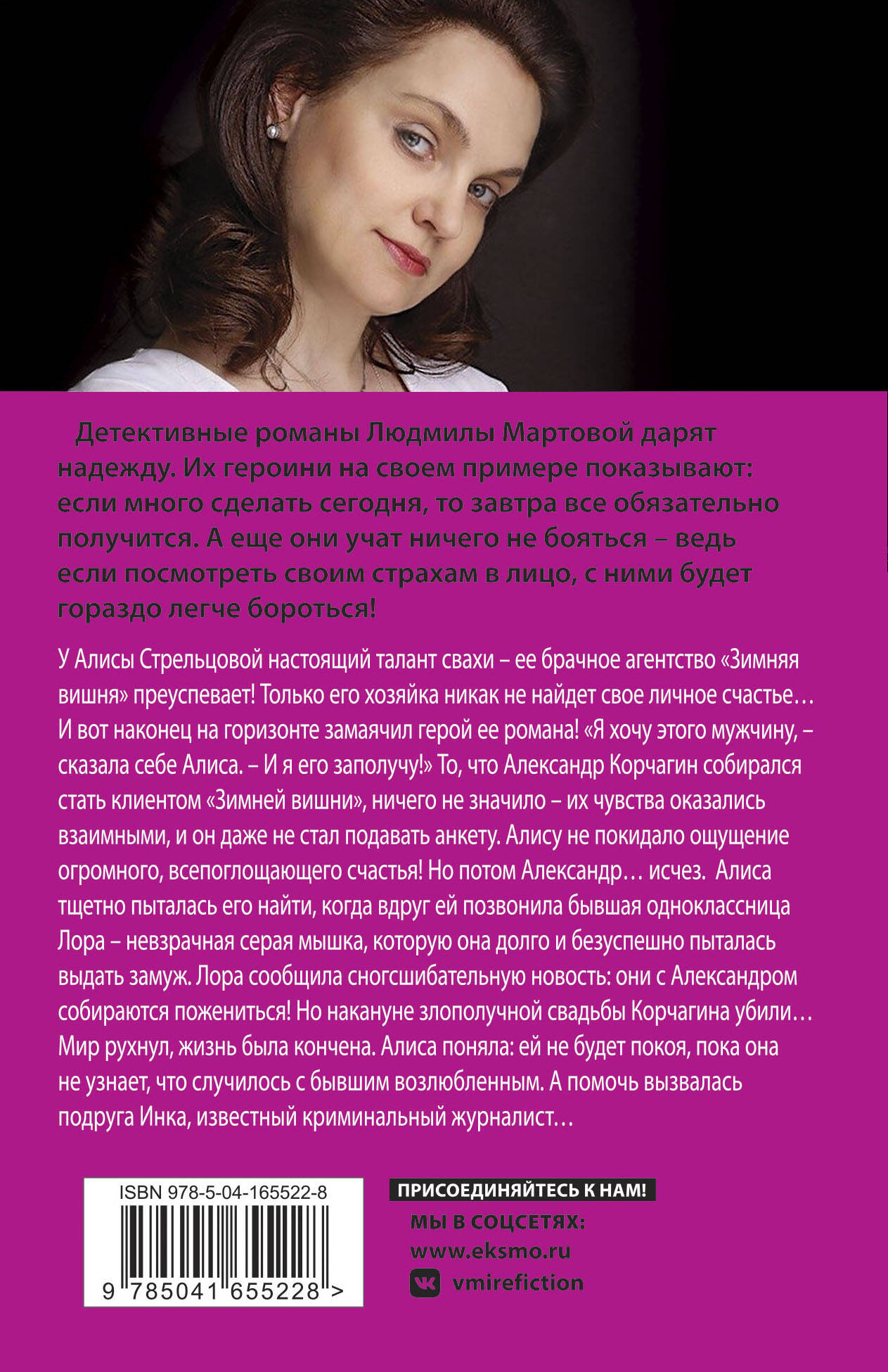 У Алисы Стрельцовой настоящий талант свахи - ее брачное агентство «Зимняя вишня» преуспевает! Только его хозяйка никак не найдет свое личное счастье… И вот наконец на горизонте замаячил герой ее романа! «Я хочу этого мужчину, - сказала себе Алиса. - И я его заполучу!» То, что Александр Корчагин собирался стать клиентом «Зимней вишни», ничего не значило - их чувства оказались взаимными, и он даже не стал подавать анкету. Алису не покидало ощущение огромного, всепоглощающего счастья! Но потом Александр… исчез. Она тщетно пыталась его найти, когда вдруг Алисе позвонила бывшая одноклассница Лора - невзрачная серая мышка, которую она долго и безуспешно пыталась выдать замуж. Лора сообщила сногсшибательную новость: они с Александром собираются пожениться! Но накануне злополучной свадьбы Корчагина убили… Мир рухнул, жизнь была кончена. Алиса поняла: ей не будет покоя, пока она не узнает, что случилось с бывшим возлюбленным. А помочь вызвалась подруга Инка, известный криминальный журналист… Людмила Мартова - мастер увлекательной детективной мелодрамы, автор захватывающих остросюжетных историй. Их отличают закрученная детективная интрига, лихой финал с неожиданной развязкой и, конечно же, яркая любовная линия. Героини романов Людмилы Мартовой - современные молодые женщины, которые точно знают, чего хотят от жизни.| Издательство | Эксмо |