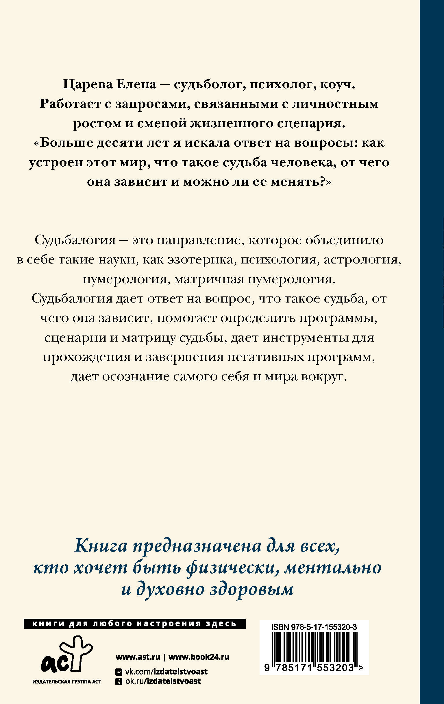 Царева Елена - судьболог, психолог, коуч. Работает с запросами, связанными с личностным ростом и сменой жизненного сценария. "Больше десяти лет я искала ответ на вопросы: как устроен этот мир, что такое судьба человека, от чего она зависит и можно ли ее менять?" Судьбалогия - это направление, которое объединило в себе такие науки, как эзотерика, психология, астрология, нумерология, матричная нумерология. Судьбалогия дает ответ на вопрос, что такое судьба, от чего она зависит, помогает определить программы, сценарии и матрицу судьбы, дает инструменты для прохождения и завершения негативных программ, дает осознание самого себя и мира вокруг.| Издательство | ИЗДАТЕЛЬСТВО "АСТ" |