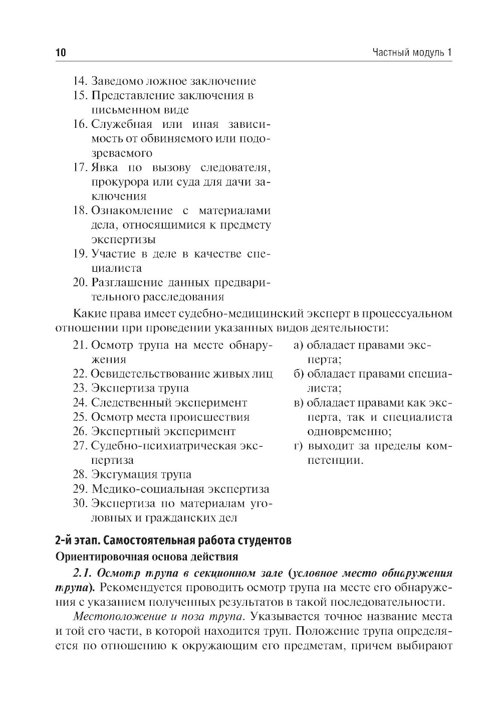 В руководстве систематизированы общие цели и конкретные задачи самостоятельной аудиторной и внеаудиторной работы студентов при изучении судебной стоматологии с выделением мотивационной характеристики каждой темы и структуры практических занятий, необходимого исходного уровня знаний, перечня приобретаемых навыков и умений, указателя изучаемых объектов, ориентировочной основы действия и примеров выполнения заданий. Учтены действующие законодательные нормы, правила и инструкции, регламентирующие производство судебно-медицинской экспертизы. Издание предназначено студентам лечебного и стоматологического факультетов медицинских вузов.| Издательство | ГЭОТАР-Медиа |