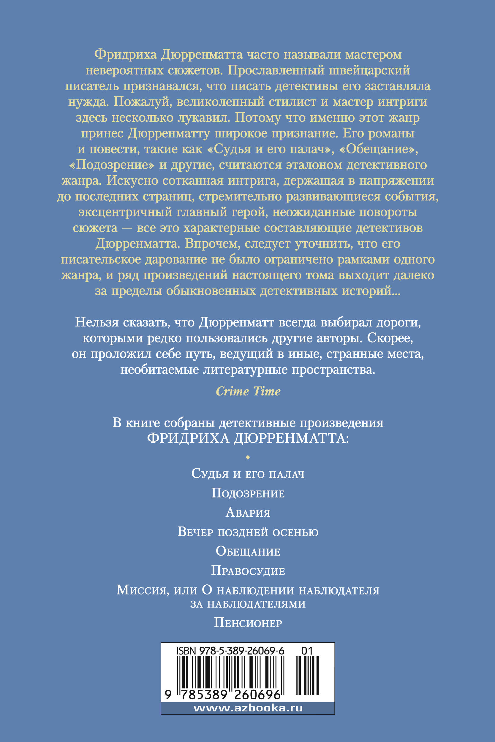 Фридриха Дюрренматта часто называли мастером невероятных сюжетов. Прославленный швейцарский писатель признавался, что писать детективы его заставляла нужда. Пожалуй, великолепный стилист и мастер интриги здесь несколько лукавил. Потому что именно этот жанр принес Дюрренматту широкое признание. Его романы и повести, такие как "Судья и его палач", "Обещание", "Подозрение" и другие, считаются эталоном детективного жанра. Искусно сотканная интрига, держащая в напряжении до последних страниц, стремительно развивающиеся события, эксцентричный главный герой, неожиданные повороты сюжета - все это характерные составляющие детективов Дюрренматта. Впрочем, следует уточнить, что его писательское дарование не было ограничено рамками одного жанра, и ряд произведений настоящего тома выходит далеко за пределы обыкновенных детективных историй...| Издательство | Азбука-Аттикус Издат.группа ООО |