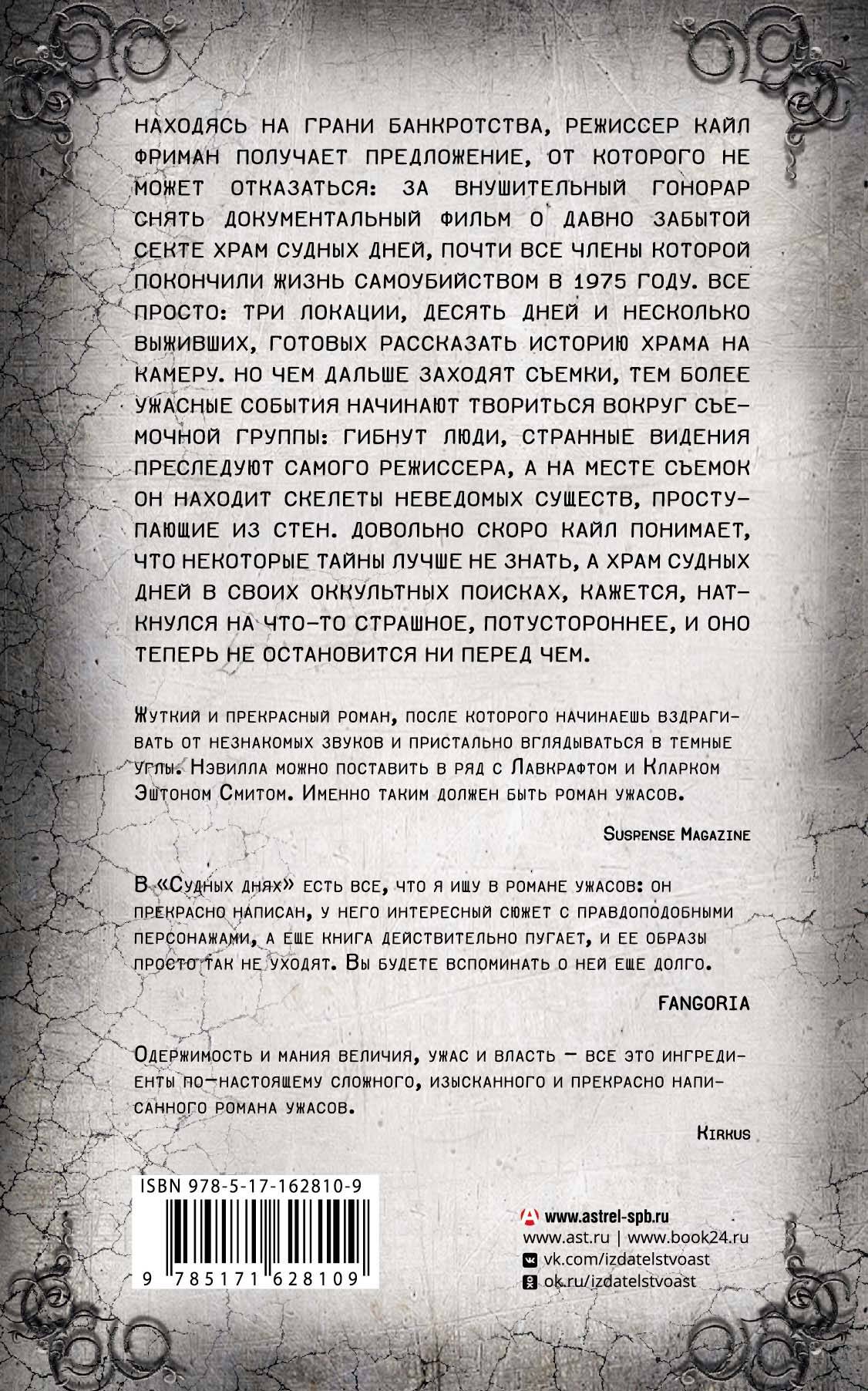 Находясь на грани банкротства, режиссер Кайл Фриман получает предложение, от которого не может отказаться: за внушительный гонорар снять документальный фильм о давно забытой секте Храм Судных дней, почти все члены которой покончили жизнь самоубийством в 1975 году. Все просто: три локации, десять дней и несколько выживших, готовых рассказать историю Храма на камеру. Но чем дальше заходят съемки, тем более ужасные события начинают твориться вокруг съемочной группы: гибнут люди, странные видения преследуют самого режиссера, а на месте съемок он находит скелеты неведомых существ, проступающие из стен. Довольно скоро Кайл понимает, что некоторые тайны лучше не знать, а Храм Судных дней в своих оккультных поисках, кажется, наткнулся на что-то страшное, потустороннее, и оно теперь не остановится ни перед чем.| Издательство | Издательство "АСТ" |