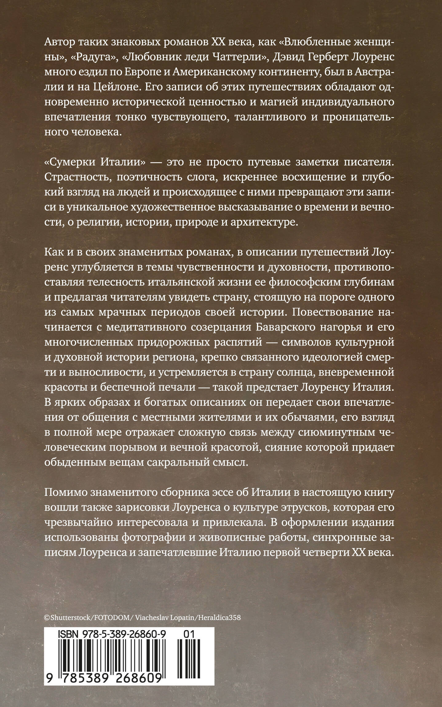 Автор таких знаковых романов XX века, как "Влюбленные женщины", "Радуга", "Любовник леди Чаттерли", Дэвид Герберт Лоуренс много ездил по Европе и Американскому континенту, был в Австралии и на Цейлоне. Его записи об этих путешествиях обладают одновременно исторической ценностью и магией индивидуального впечатления тонко чувствующего, талантливого и проницательного человека. "Сумерки Италии" - это не просто путевые заметки писателя. Страстность, поэтичность слога, искреннее восхищение и глубокий взгляд на людей и происходящее с ними превращают эти записи в уникальное художественное высказывание о времени и вечности, о религии, истории, природе и архитектуре. Как и в своих знаменитых романах, в описании путешествий Лоуренс углубляется в темы чувственности и духовности, противопоставляя телесность итальянской жизни ее философским глубинам и предлагая читателям увидеть страну, стоящую на пороге одного из самых мрачных периодов своей истории. Повествование начинается с медитативного созерцания Баварского нагорья и его многочисленных придорожных распятий - символов культурной и духовной истории региона, крепко связанного идеологией смерти и выносливости, и устремляется в страну солнца, вневременной красоты и беспечной печали - такой предстает Лоуренсу Италия. В ярких образах и богатых описаниях он передает свои впечатления от общения с местными жителями и их обычаями, его взгляд в полной мере отражает сложную связь между сиюминутным человеческим порывом и вечной красотой, сияние которой придает обыденным вещам сакральный смысл. Помимо знаменитого сборника эссе об Италии в настоящую книгу вошли также зарисовки Лоуренса о культуре этрусков, которая его чрезвычайно интересовала и привлекала. В оформлении издания использованы фотографии и живописные работы, синхронные записям Лоуренса и запечатлевшие Италию первой четверти ХХ века.| Издательство | Азбука-Аттикус Издат.группа ООО |
