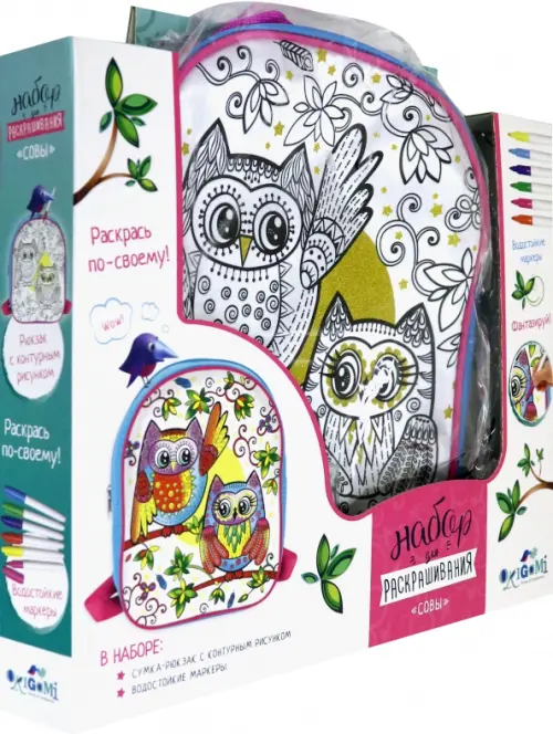Набор для раскрашивания Совы. Предложите юной моднице почувствовать себя дизайнером и раскрасить красивый рюкзачок с веселыми совятами. Водостойкие маркеры позволят краске не бояться даже дождивой погоды, а плотные контуры предотвратят растекание цветов! Такая творческая работа очень полезна - она развивает мелкую моторику, цветовосприятие, креативное мышление и воображение ребенка. Родителей обязательно порадует качество и вместительность рюкзачка, а девочки станут обладательницами неповторимого аксессуара! Блестящий результат восхитит всех! Комплектность: сумка с контурным рисунком (22х28 см), водостойкие маркеры (6 штук). Материалы: текстильные и полимерные материалы с элементами металла, чернила. Не предназначено для детей младше 3-х лет. Производитель: Россия.