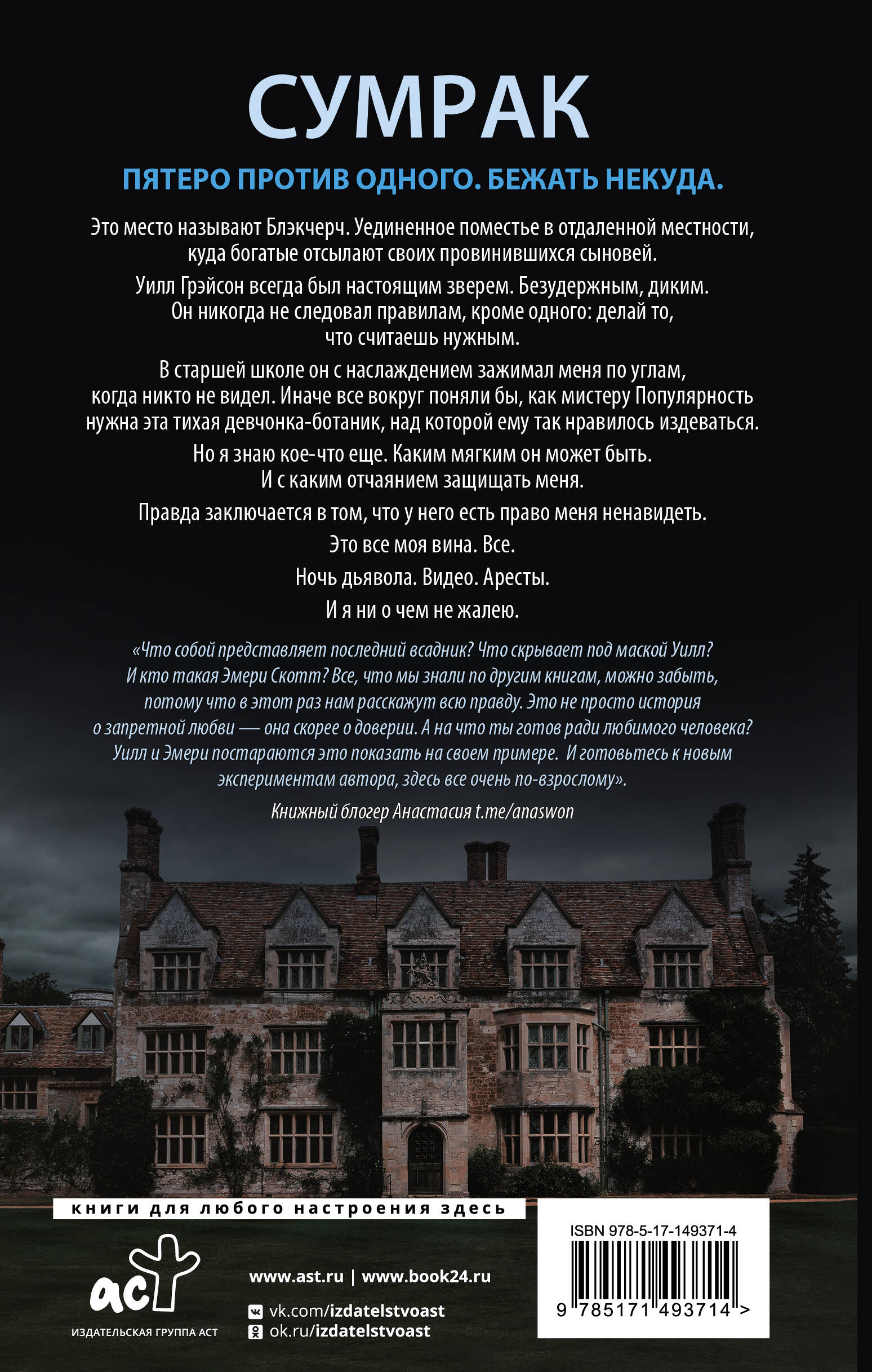 - От автора бестселлеров New York Times, USA Today и Wall Street Journal. - Пенелопа Дуглас - королева тёмного New Adult романа. - Пятая и заключительная часть цикла «Ночь дьявола»! - Герои цикла «Ночь дьявола» - морально серые личности с внутренними демонами и призраками прошлого. В «Сумраке» в центре сюжета история Уилла и Эмери. - Захватывающая тёмная сага получит долгожданную развязку и достойный финал. Блэкчерч - это тёмное элитное место, тюрьма-пансионат для тех, кому требуется искупление и время. Богатые родители отправляют туда своих сыновей. Уилл - один из «приговорённых». Но заточение не то, что пойдёт парню на пользу в том виде, в каком надеется его влиятельный дедушка. Уилл готовит план, и его цель - отомстить Эмери, которая виновна в его заточении. Но, может быть, Уилл просто хочет поблагодарить её. Ведь Блэкчерч сделал его только сильнее, расчётливее и опаснее.| Издательство | АСТ |