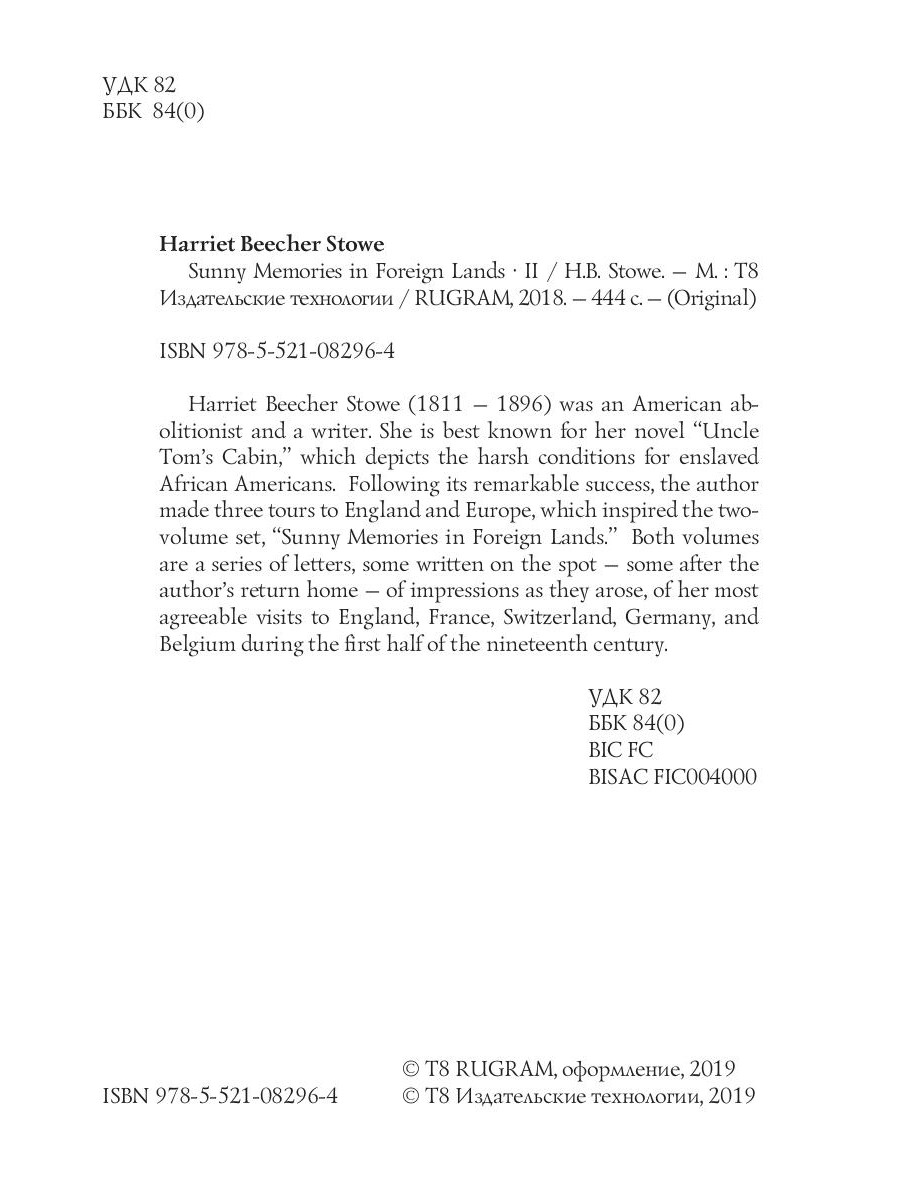 Harriet Beecher Stowe (1811 - 1896) was an American abolitionist and a writer. She is best known for her novel "Uncle Tom's Cabin," which depicts the harsh conditions for enslaved African Americans. Following its remarkable success, the author made three tours to England and Europe, which inspired the two-volume set, "Sunny Memories in Foreign Lands." Both volumes are a series of letters, some written on the spot - some after the author's return home - of impressions as they arose, of her most agreeable visits to England, France, Switzerland, Germany, and Belgium during the first half of the nineteenth century.| Издательство | Т8 RUGRAM |