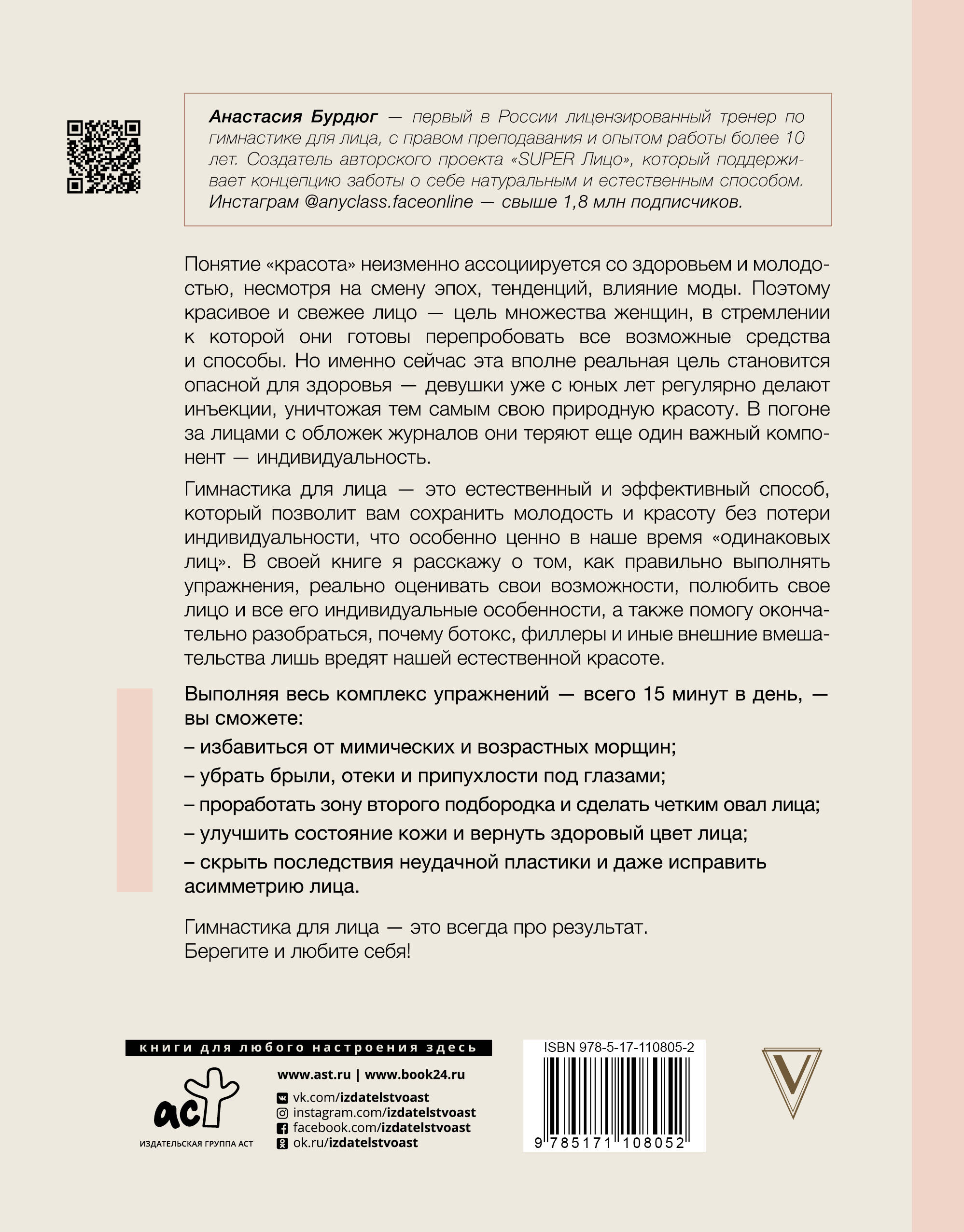 Анастасия Бурдюг - первый в России лицензированный тренер по гимнастике для лица, с правом преподавания и опытом работы более 10 лет. Создатель авторского проекта «SUPER Лицо», который поддерживает концепцию заботы о себе натуральным и естественным способом. Инстаграм @anyclass.faceonline - свыше 1,8 млн подписчиков. Предисловие - от гуру фейсфитнеса Кэрол Мэджио!| Издательство | Издательство "АСТ" |