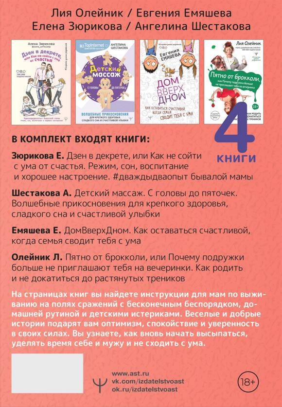Книги от опытных мам - в помощь заботливым родителям. Вы узнаете, как не утонуть в подгузниках, непрошеных советах, поучениях и стереотипах. Поймете, как оставаться собой и получать удовольствие от материнства. Вы найдете ответы на самые животрепещущие вопросы о том, как: • не превратиться в ЯЖМАТЬ; • остаться желанной для мужа; • не мучить домашних гиперконтролем и гиперопекой; • находить время на себя, оставаясь счастливой и энергичной. А также получите: • советы по уходу и питанию, которые помогут укрепить иммунитет; • знания по физиологии ребенка, необходимые родителям; • техники массажа, подходящие для каждого возраста малыша. Авторы рассмешат вас, успокоят, поделятся лайфхаками и помогут понять, что вы отличная мама, даже если ваша жизнь далека от идеальных картинок из соцсетей.| Издательство | Издательство "АСТ" |