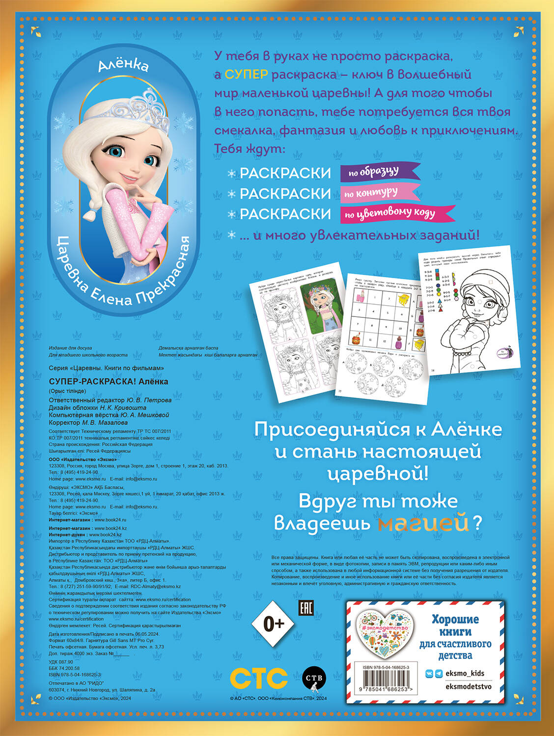 Если ваша любимая героиня в мультсериале «Царевны» Аленка и вы так же, как она, очень добры и нежны, всегда стараетесь всё уладить мирно, то скорее открывайте раскраску и погружайтесь в необычный мир маленькой царевны! Вас ждут игры, лабиринты, поиск отличий и много-много раскрасок. Ну и какое же путешествие без суперпомощников? На протяжении всей раскраски вас будут сопровождать ваши любимые герои мультсериала, чтобы подбадривать вас, когда станет немного тяжело!| Издательство | ООО "Издательство "Эксмо" |