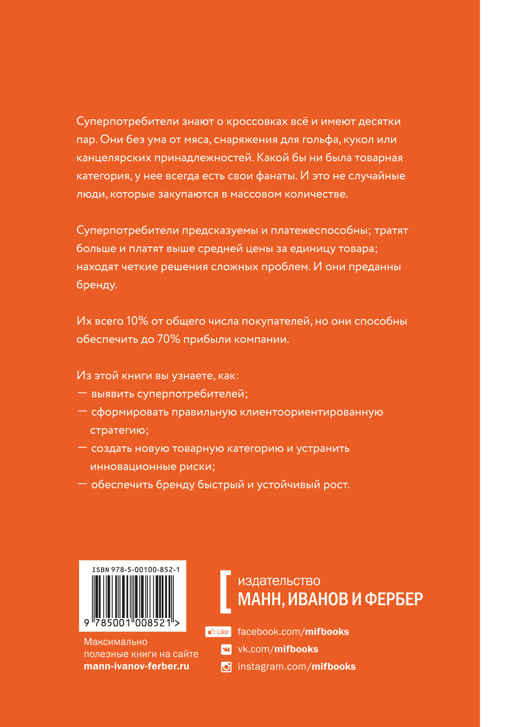Как увеличить продажи за счет эмоциональных покупателей? Почему суперпотребители, будучи незначительной частью от общего числа покупателей, способны обеспечить до 70% прибыли? Эдди Юн рассказывает, как найти суперпотребителей и перестроить маркетинговые стратегии, основываясь на их мнении и опыте.| Издательство | МАНН, ИВАНОВ И ФЕРБЕР ООО |