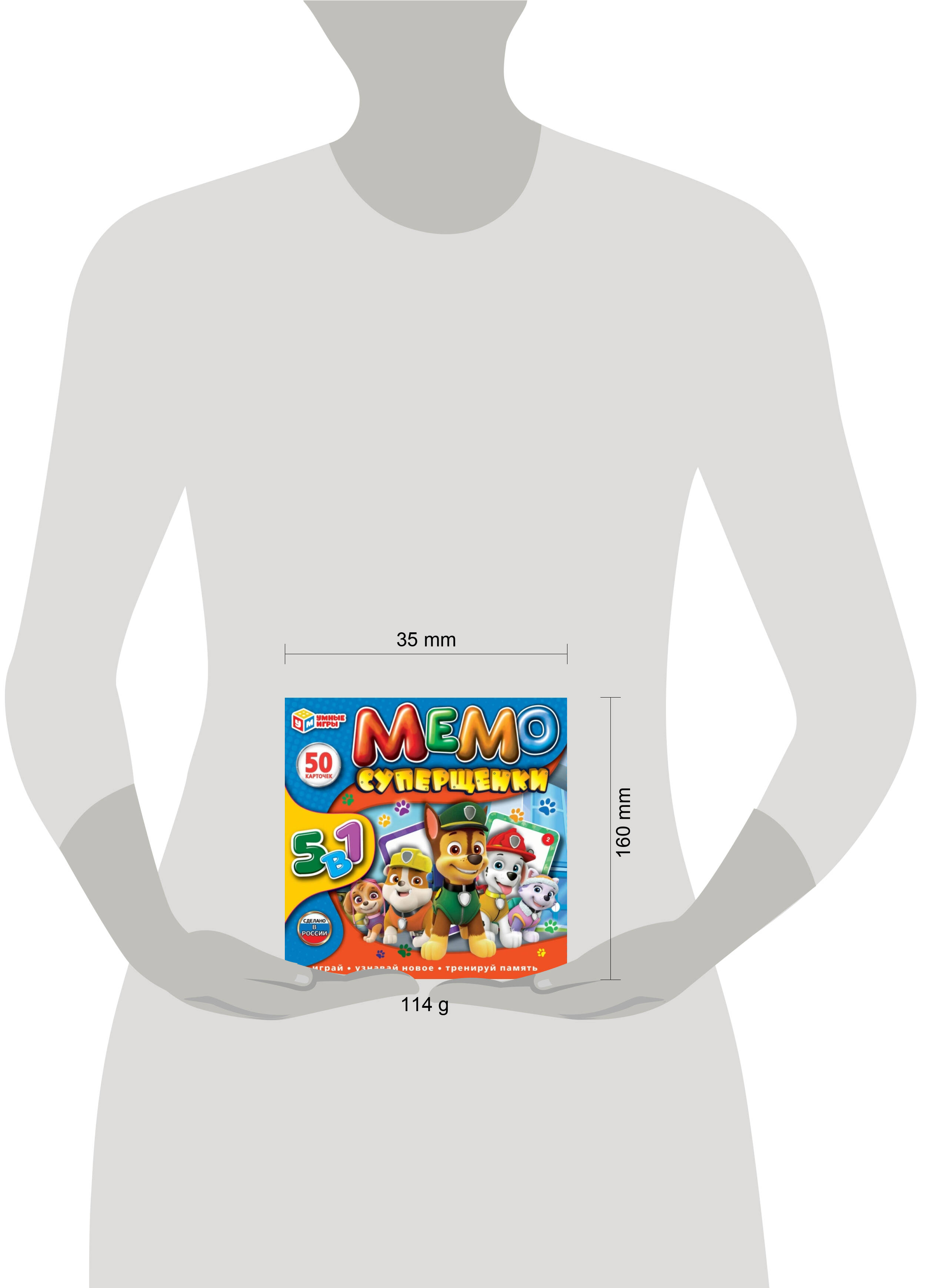 Настольная игра 5 в 1 "Мемо. Суперщенки" ТМ "Умные игры" - интересная развивающая игра, которая обязательно понравится детям. Особенности: - 5 вариантов игр - красочный дизайн с милыми персонажами - количество игроков: 2-6 - продолжительность игры: 20 минут - играй, узнавай новое, тренируй память! Состав игры: - 50 карточек - правила Мемо - увлекательная игра для всей семьи! С её помощью ребёнок научится сопоставлять и сравнивать изображения на карточках, запоминать их расположение. ИГРА 1. "НАЙДИ ПАРУ" Карточки кладутся рубашкой вверх. Каждый из игроков по очереди переворачивает по две карточки картинкой вверх так, чтобы другие игроки могли увидеть, что на них изображено. Если картинки на карточках одинаковые, то игрок забирает карточки себе и делает следующий ход. Игрок может продолжать игру до тех пор, пока находит одинаковые карточки. Если же на карточках картинки не совпадают, ход переходит к следующему игроку. При этом игрок переворачивает карточки обратно рубашкой вверх. ИГРА 2. "ЧТО ПРОПАЛО?" Выберите из колоды несколько неповторяющихся карточек. Положите карточки перед игроками картинками вверх. Попросите их назвать, что изображено на карточках. Если дети не справляются, назовите картинки сами и попросите детей повторить за вами. Дайте игрокам время (20-30 секунд) запомнить, что изображено на картинках. Далее попросите игроков закрыть глаза, уберите одну карточку. Когда игроки откроют глаза, предложите угадать, какой картинки не хватает. Если дети быстро справляются с заданием, усложните его : перемешайте оставшиеся карточки либо увеличьте их количество. ИГРА 3. "ОТГАДАЙ-КА" Разложите на столе несколько разных карточек. Выберите первого ведущего - например, это может быть самый младший игрок. Далее ход переходит по часовой стрелке. Ведущий выбирает карточку, не показывая её, и описывает другим, что на ней изображено, не называя саму картинку. Например, если он выбрал карточку с изображением хамелеона, он может сказать так: "на этой карточке изображена разноцветная ящерица". Задача остальных игроков - отгадать карточку, которую описывает ведущий. ИГРА 4. "КАРТОЧНОЕ ЛОТО" Каждый игрок должен выбрать от 6 до 12 пар карточек с одинаковыми изображениями, всего их должно быть 12 или 24. Игроки помещают перед собой по одной карточке из пары рубашкой вверх. Остальные карточки перемешиваются и кладутся в центр стола между всеми игроками рубашкой вверх. Каждый из игроков по очереди тянет карточку из общей стопки. Если она совпадает с одной из карточек, лежащих перед ним, то он кладёт её перед собой, переворачивая обе рубашкой вверх. Если у игрока нет такой карточки, он возвращает её обратно в общую стопку и перемешивает колоду. Игра заканчивается, когда один из игроков подберёт пару каждой своей карточке. ИГРА 5. "КТО ГДЕ СПРЯТАЛСЯ?" Выложите перед игроками несколько карточек картинками вверх. Дайте игрокам время (20-30 секунд), чтобы запомнить, в каком порядке лежат картинки. Переверните карточки. Попросите игроков по очереди показать, где какая картинка лежит (кто где спрятался?). Вы можете использовать игру для того, чтобы закрепить с ребёнком понятия "лево", "право", "верх", "низ", а также порядковые числительные. Для этого попросите ребёнка не показывать на "спрятавшуюся" карточку, а описывать словами, где она лежит. Например, "носорог спрятался на третьей кар