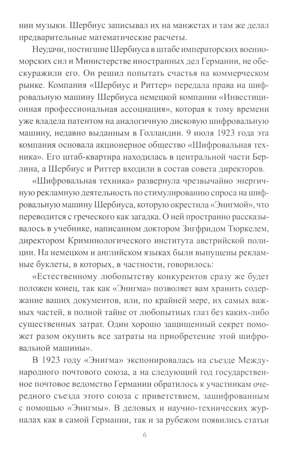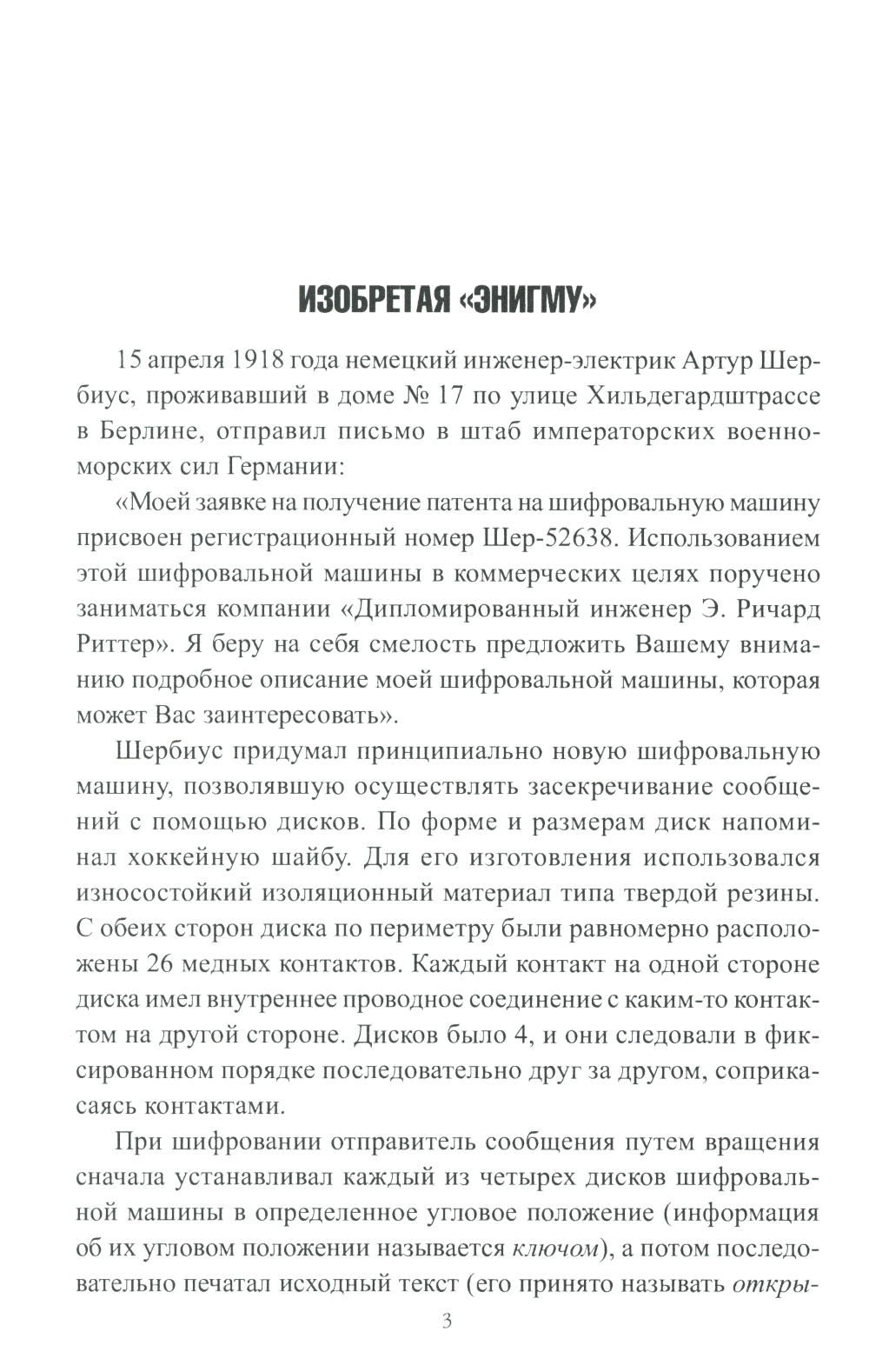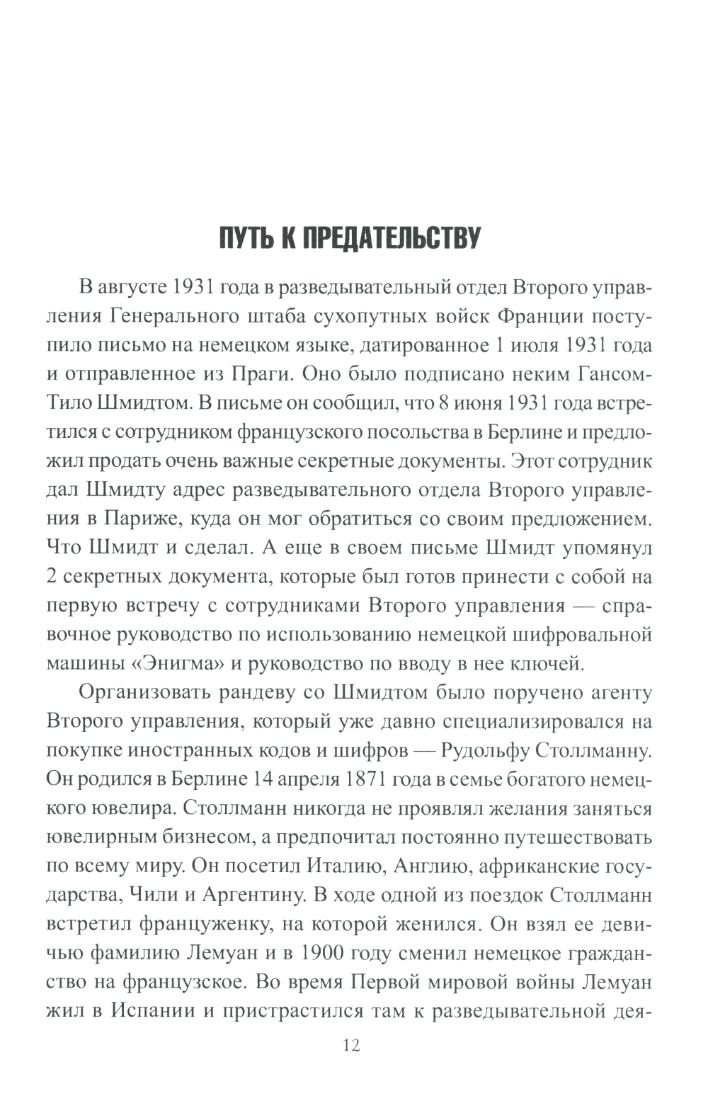 Ганс-Тило Шмидт (1888-1943) - шпион, известный под кодовым именем «Asche», или «Source D». С августа 1931 по март 1940 года он продавал французской военной разведке сверхсекретные данные о шифровальной машине «Энигма», которая использовалась вооруженными силами Германии. Полученные данные передавались польским математикам. Поляки вместе с союзниками, включая Францию и Великобританию, смогли прочитать большую часть зашифрованного «Энигмой» трафика. Но важнее всего, Шмидт информировал французов о стратегических планах Гитлера, включая перевооружение Германии, присоединение к ней Рейнской области, Австрии и Судет, а также раздел Чехословакии и нападение на Польшу, положившее начало Второй мировой войне. Читателя ждет захватывающее повествование о шпионской карьере Шмидта и о его разоблачении в 1943 году.| Издательство | Вече |