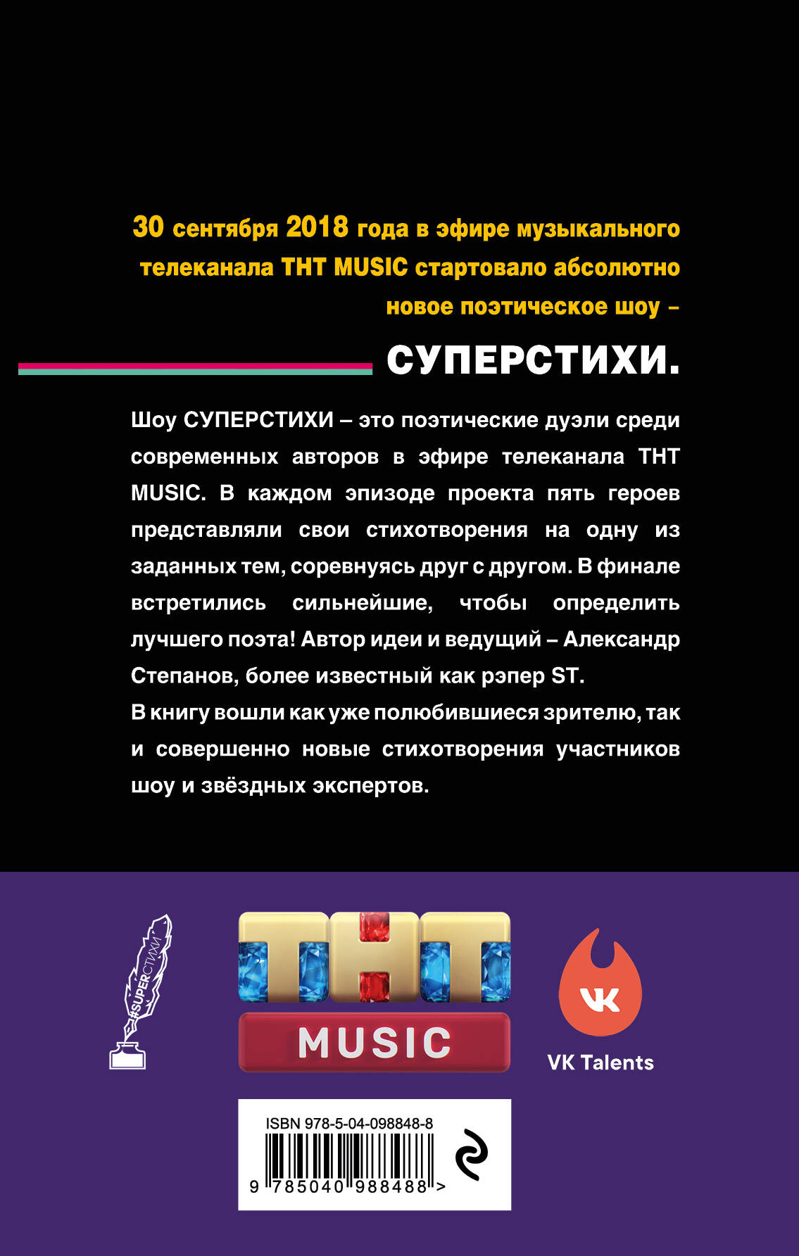 Шоу СУПЕРСТИХИ - это поэтические дуэли среди современных авторов в эфире телеканала ТНТ music. В каждом эпизоде проекта пять героев представляли свои стихотворения на одну из заданных тем, соревнуясь друг с другом. В финале встретились сильнейшие, чтобы определить лучшего поэта! Автор идеи и ведущий - Александр Степанов, более известный как рэпер ST. В книгу вошли как уже полюбившиеся зрителю, так и совершенно новые стихотворения участников шоу и звёздных экспертов.| Издательство | ООО "Издательство "Эксмо" |