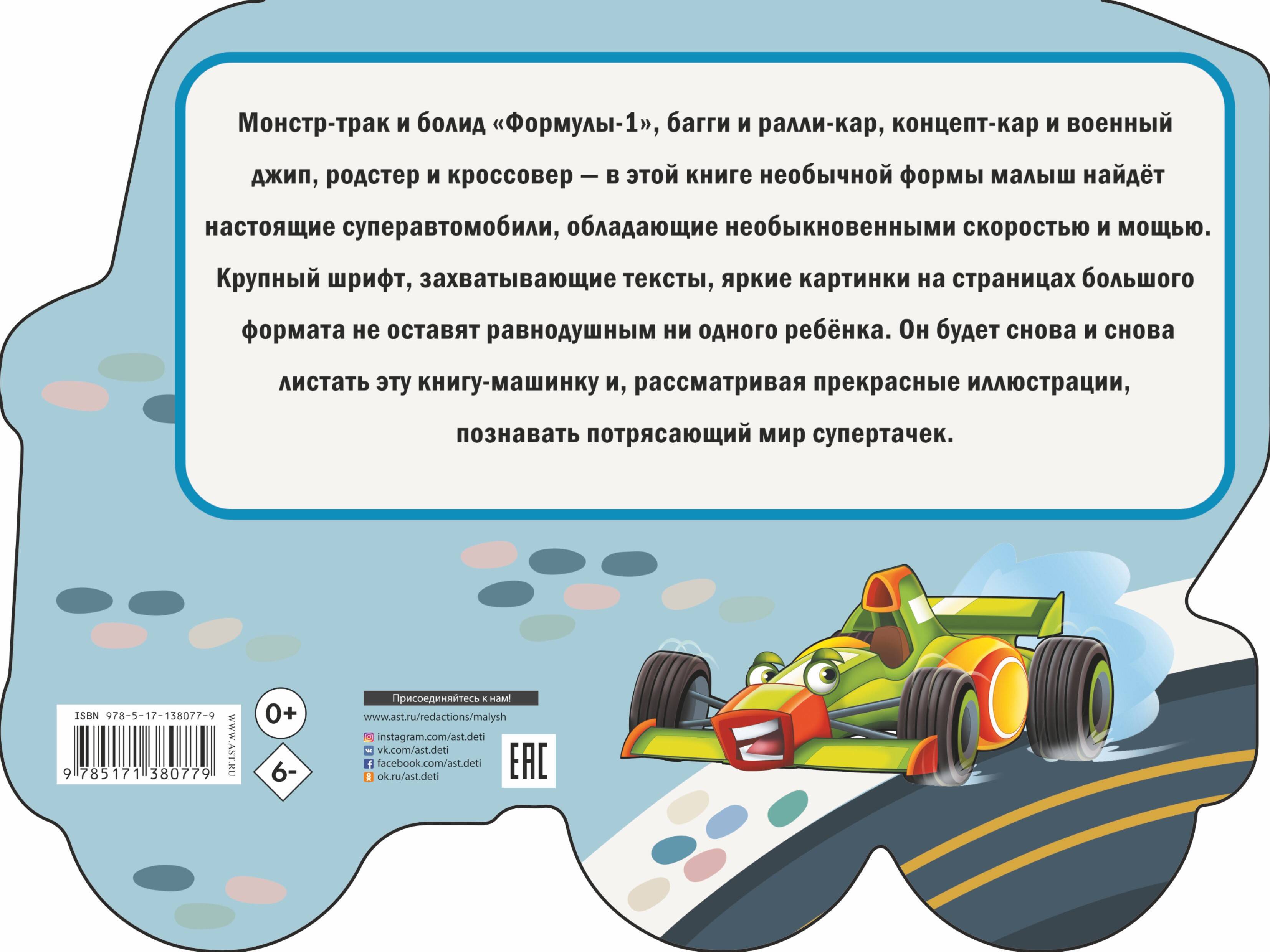 Монстр-трак и болид "Формулы-1", багги и бигфут, ралли-кар и концепт-кар, ранэбаут и военный джип, родстер и кроссовер - в этой книге необычной формы малыш познакомится с настоящими суперавтомобилями, обладающими необыкновенными скоростью и мощью. Крупный шрифт, захватывающие тексты, прекрасные картинки на страницах большого формата не оставят равнодушным ни одного ребёнка. Он будет снова и снова листать эту книгу-машинку, рассматривать потрясающие иллюстрации и то и дело устраивать тест-драйв для своих супертачек.| Издательство | ИЗДАТЕЛЬСТВО "АСТ" |