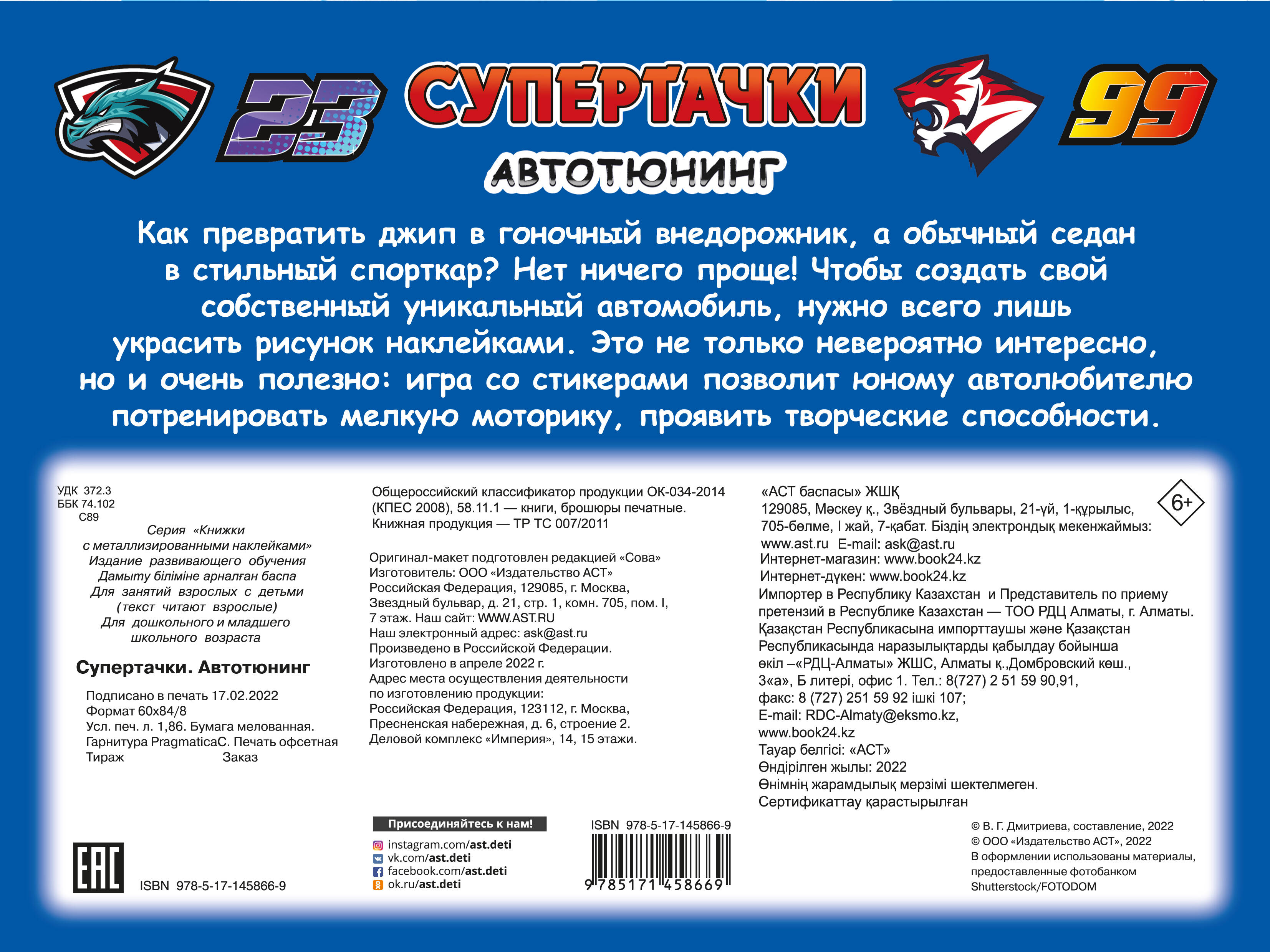 «Супертачки. Автотюнинг» - это книжка-конструктор для юных автолюбителей. На страницах книги - изображения автомобилей: внедорожников, фургонов, спортивных купе. Используя эти картинки в качестве основы, с помощью ярких наклеек, в том числе металлизированных, ребёнок будет создавать свои собственные неповторимые автомобили.| Издательство | АСТ |