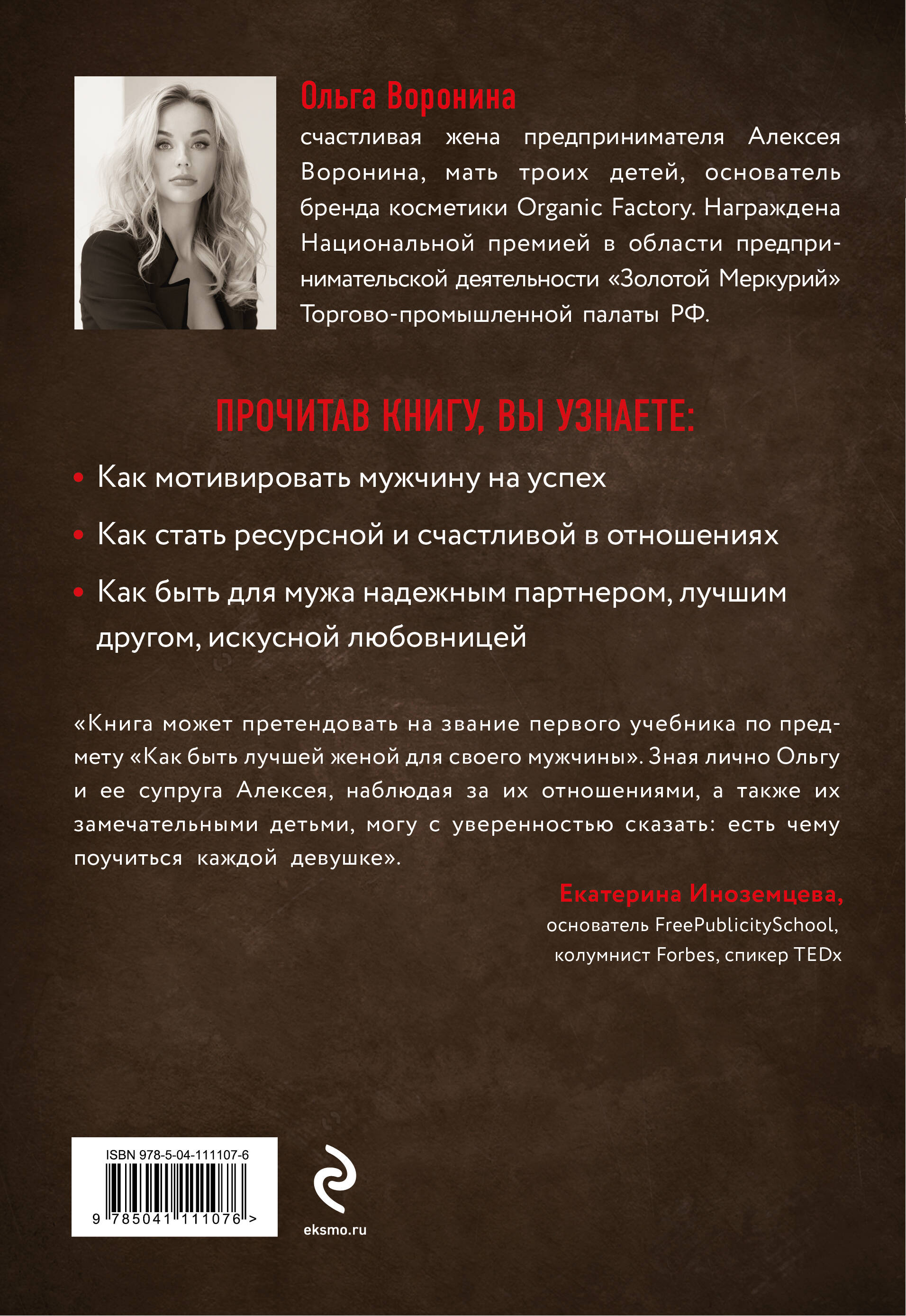 Ольга Воронина - жена известного предпринимателя Алексея Воронина, мать троих детей, основатель косметического бренда Organic Factory. В книге даны ответы на вопросы: - как сохранить баланс между работой, семьей, хобби; - как всё успеть и удачно выйти замуж; - как создать и сохранить успешный брак; - как мотивировать мужчину на успех. «Эта книга может претендовать на звание первого учебника-практикума по предмету «Как быть лучшей женой для своего мужчины». Зная лично Ольгу и ее супруга Алексея, наблюдая за их отношениями, а также их замечательными детьми, могу с уверенностью сказать: есть чему поучиться каждой девушке». - Екатерина Иноземцева, Основатель FreePublicitySchool, колумнист Forbes, спикер TEDx| Издательство | ООО "Издательство "Эксмо" |