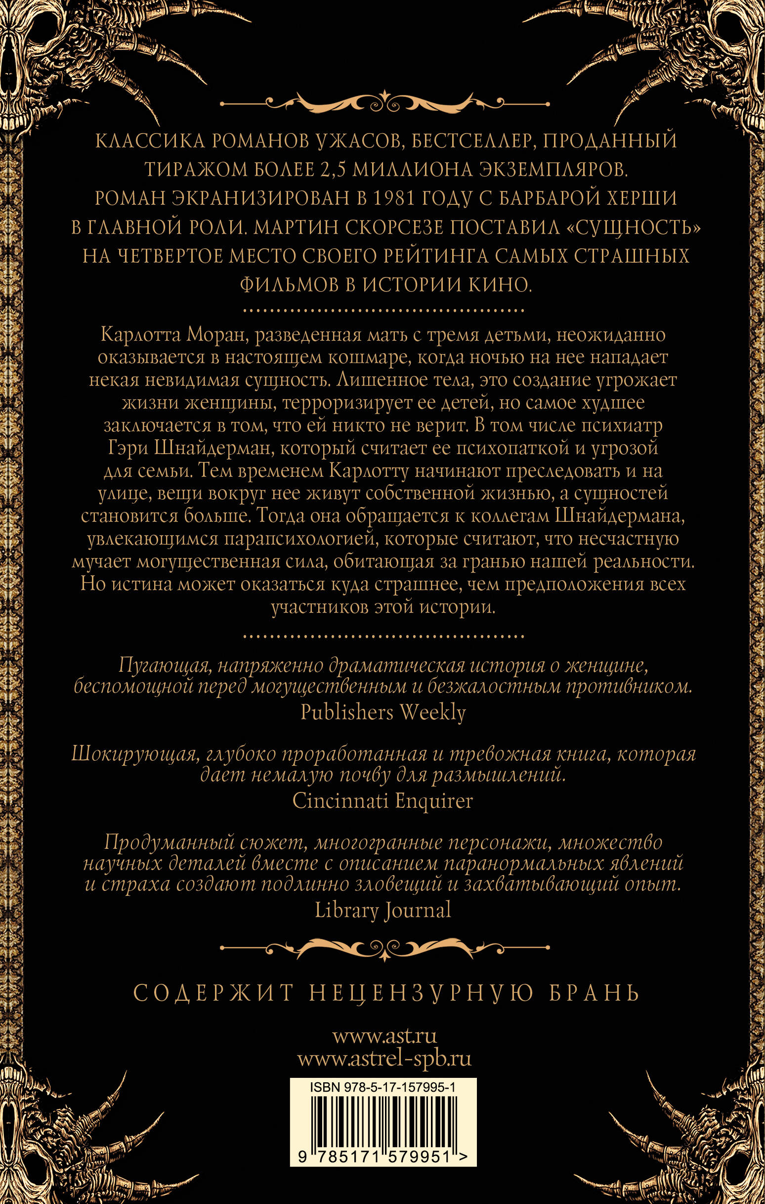 Новая книга в серии «Легенды хоррора». Для всех поклонников творчества Клайва Баркера, Питера Страуба и Адама Нэвилла. Прославленный сценарист и многократный лауреат премии «Эмми» Фрэнк де Фелитта входит в первую волну авторов классического американского хоррора, фактически воскресивших жанр в семидесятых-восьмидесятых годах прошлого века. Его романы «Одри Роуз» и «Сущность» стали бестселлерами и были экранизированы практически сразу после выхода, причем знаменитый режиссер Мартин Скорсезе включил экранизацию «Сущности» в пятерку самых страшных фильмов, что он когда-либо видел.| Издательство | Издательство "АСТ" |