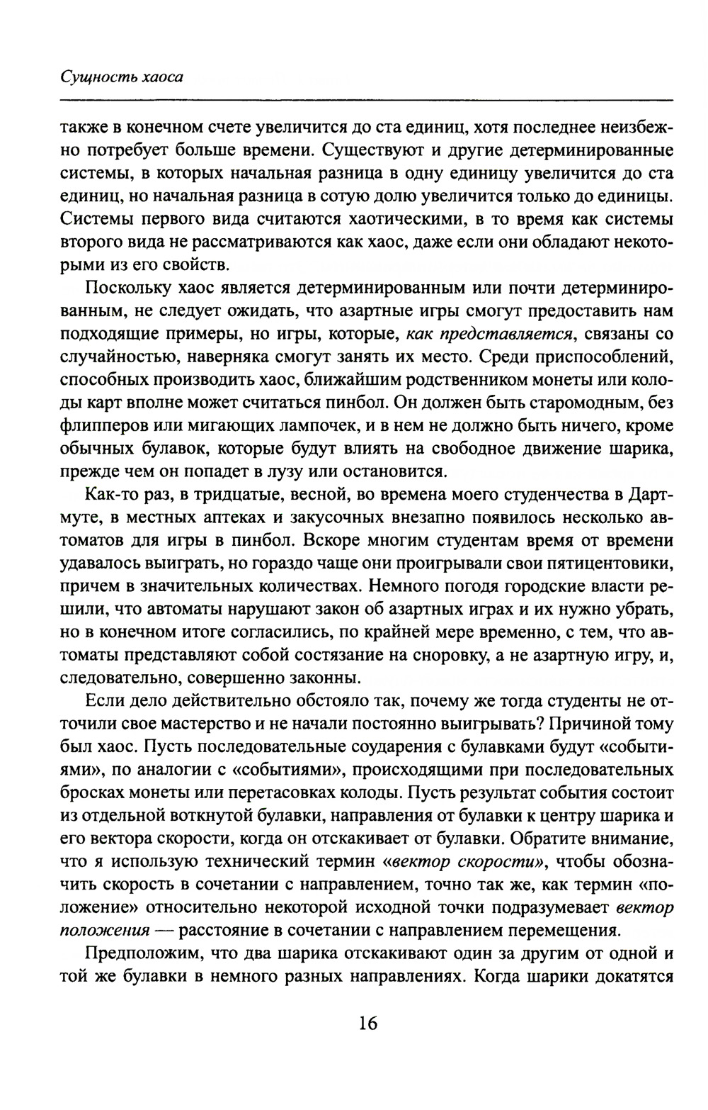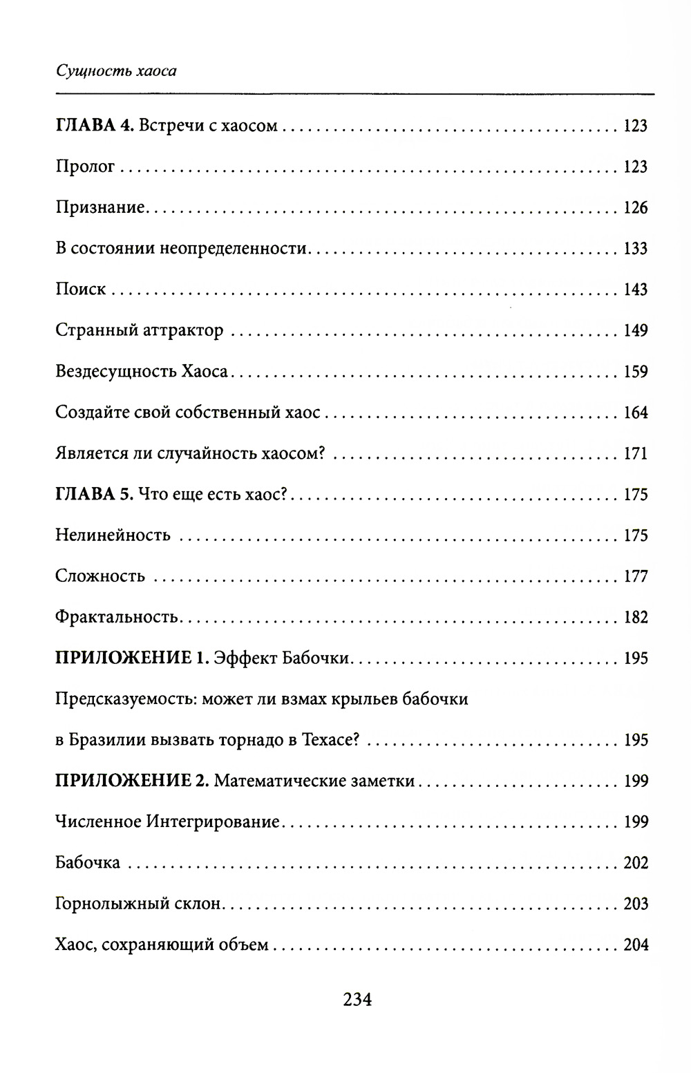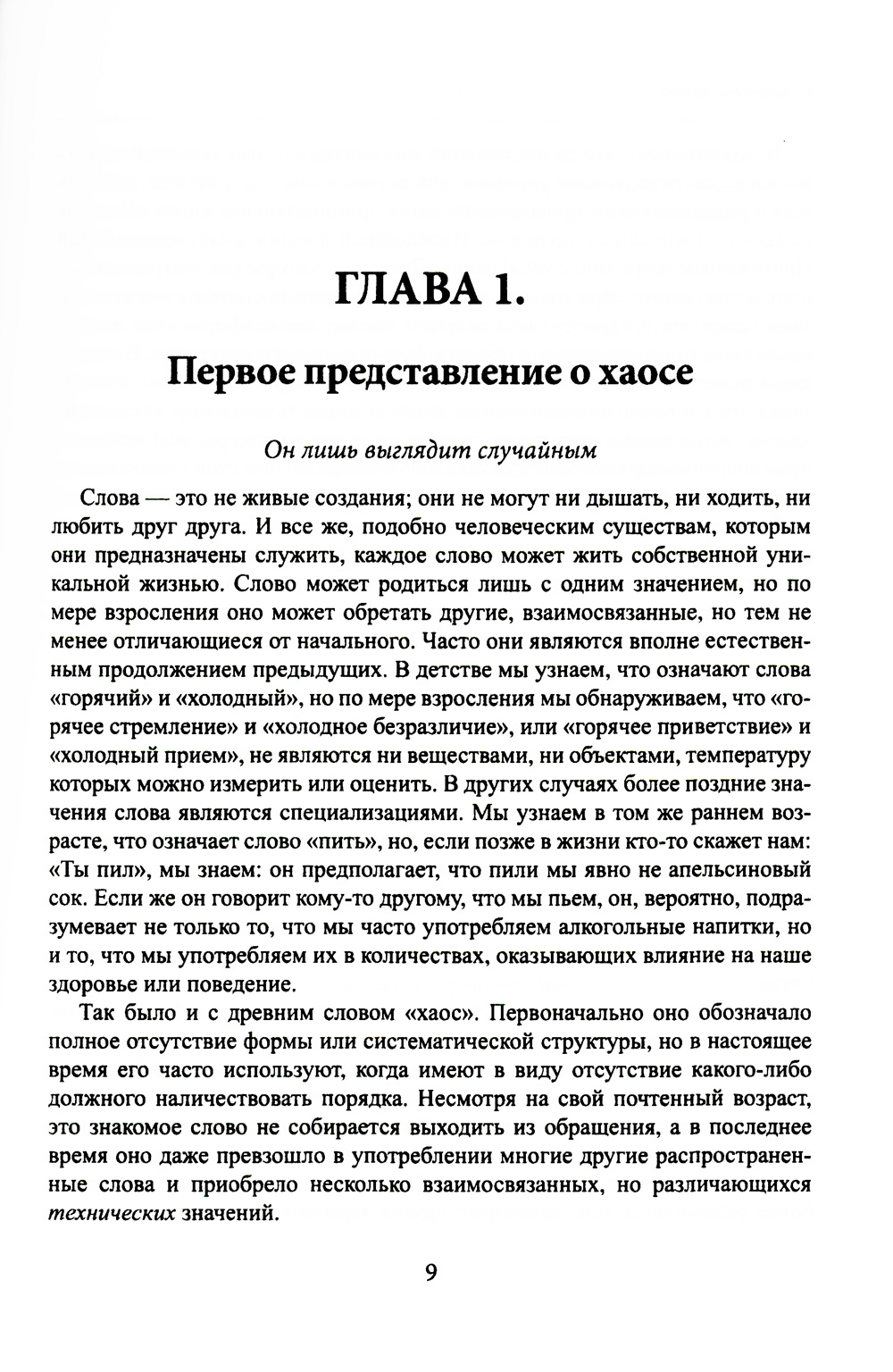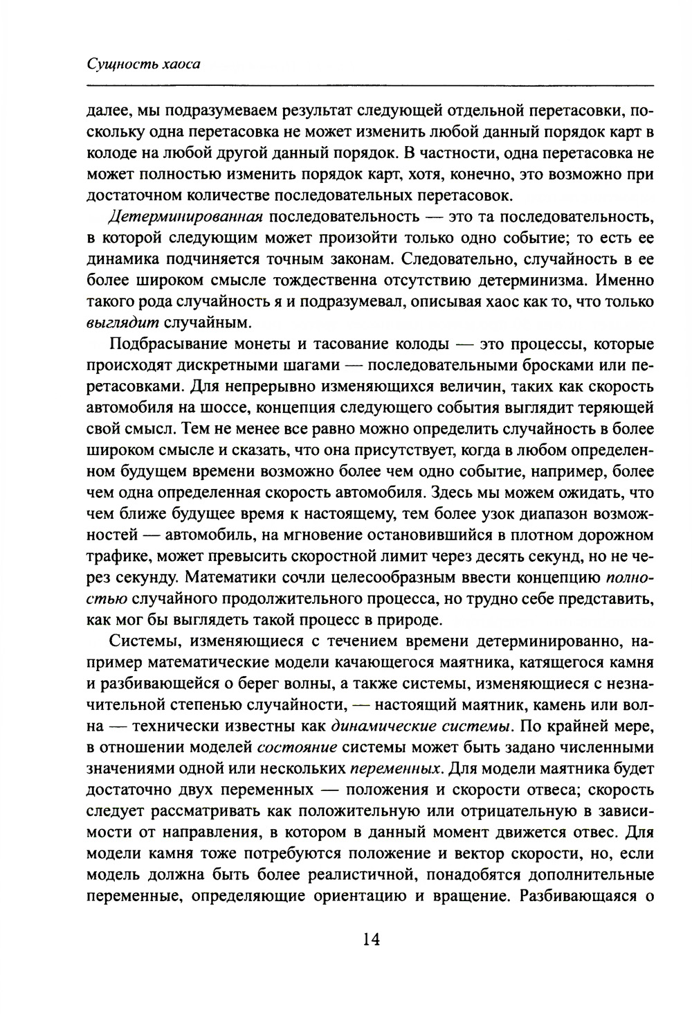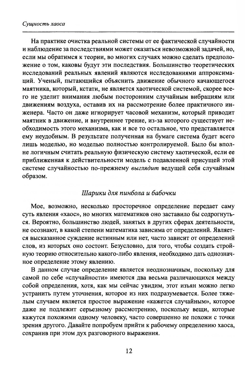 В отличие от явлений, рассматриваемых в теории относительности и квантовой механике, системы, которые сейчас описываются как «хаотические», можно наблюдать без телескопов или микроскопов. Они варьируются от простейших событий до самых сложных процессов: от падения листа до колебаний климата. Однако любой подобный процесс имеет определенные количественные характеристики. То, как он разворачивается, чувствительно зависит от его текущего состояния, поэтому он и кажется случайным, хотя таковым не является. Лоренц использует примеры из повседневной жизни и простые вычисления, чтобы показать сущность хаотических систем. В качестве основного иллюстративного примера он построил математическую модель доски, скользящей по горнолыжному склону. С помощью этой модели он объясняет различные хаотические явления, в том числе некоторые связанные с ними концепции, такие как странные аттракторы и бифуркации. В «Сущности хаоса» Лоренц представляет широкому читателю особенности «новой науки» и ее влияние на современную жизнь - от предсказания погоды до философии.