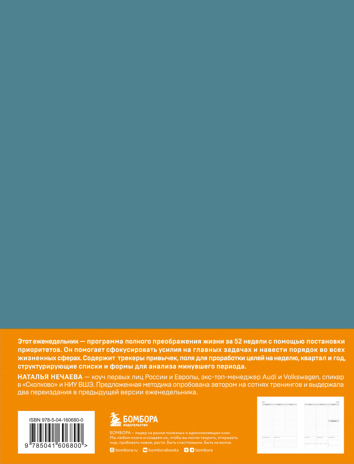 Этот еженедельник - программа полного преображения жизни за 52 недели с помощью постановки приоритетов. Он помогает сфокусировать усилия на главных задачах и навести порядок во всех жизненных сферах. Содержит трекеры привычек, поля для проработки целей на неделю, квартал и год, структурирующие списки и формы для анализа минувшего периода. Наталья Нечаева - коуч первых лиц России и Европы, экс-топ-менеджер Audi и Volkswagen, спикер в «Сколково» и НИУ ВШЭ. Предложенная методика опробована автором на сотнях тренингов и выдержала два переиздания в предыдущей версии еженедельника - «Еженедельника про приоритеты».| Издательство | ООО "Издательство "Эксмо" |