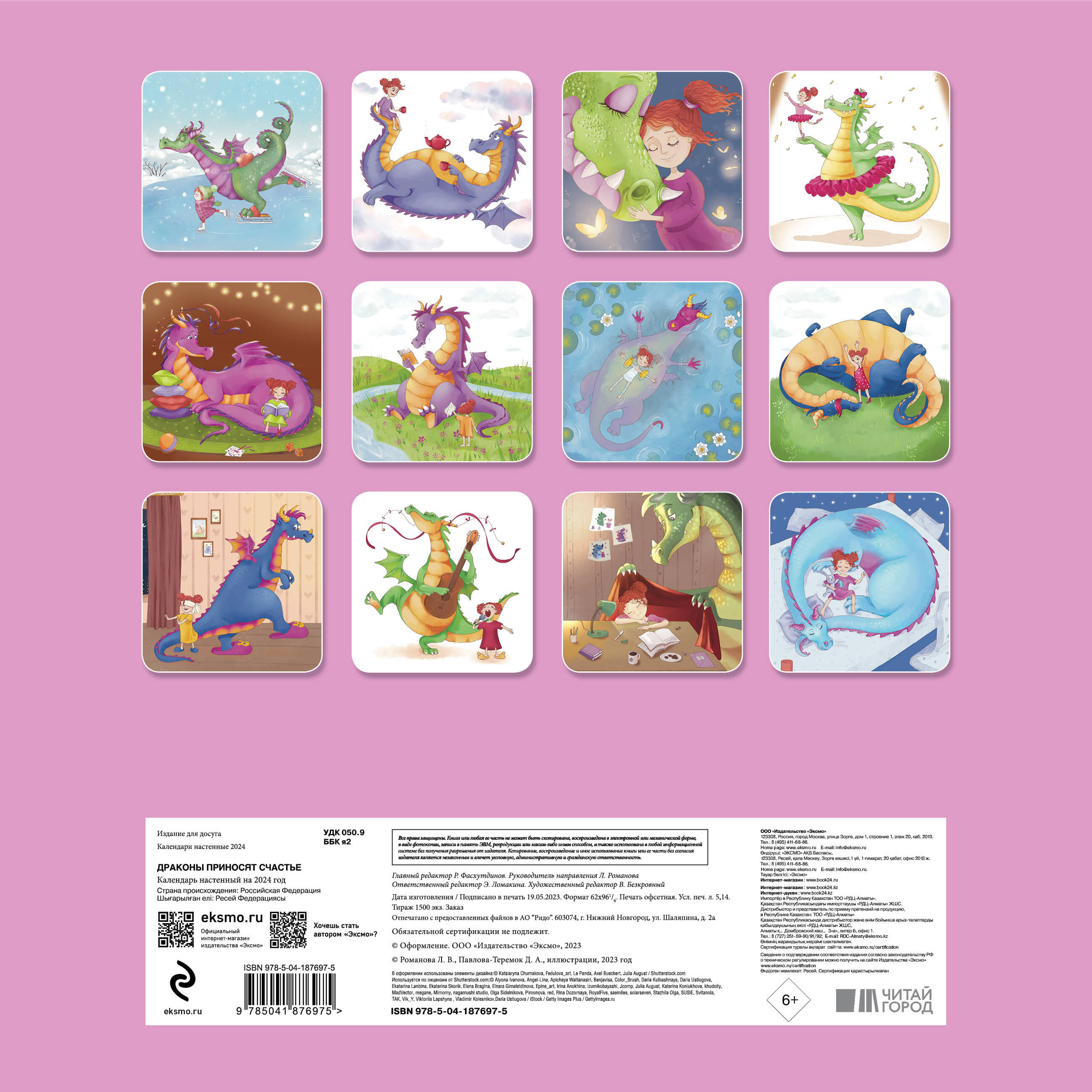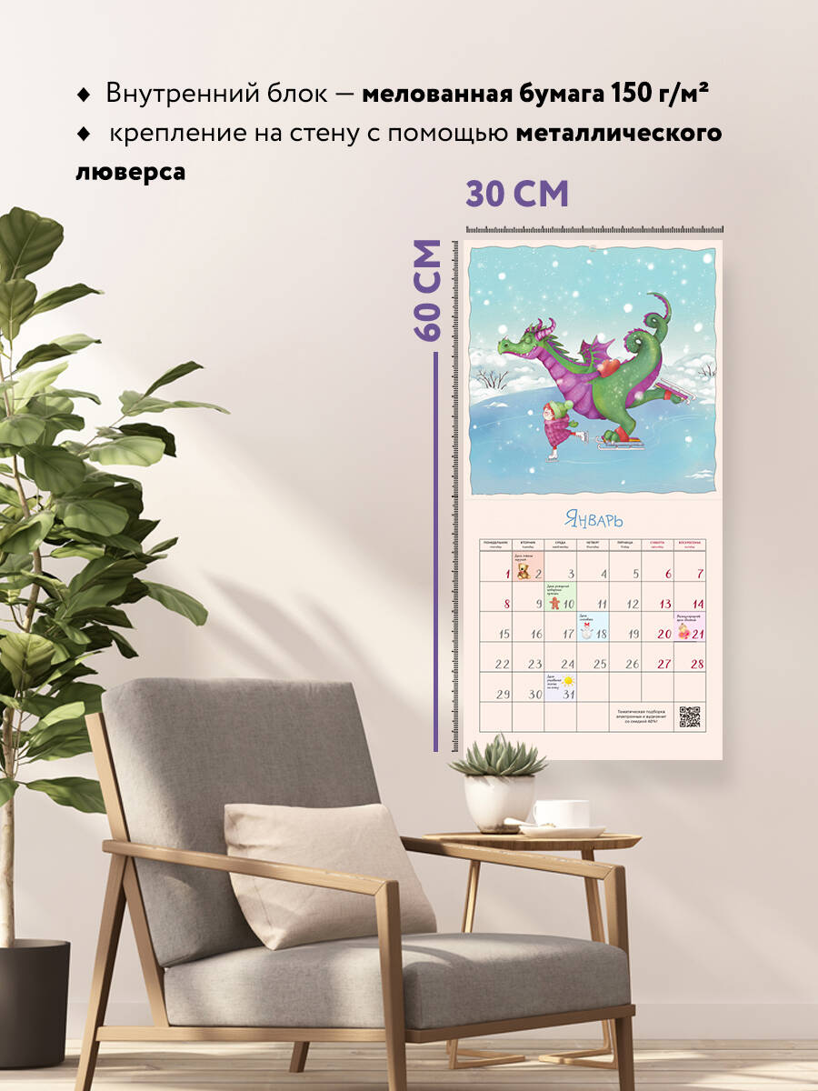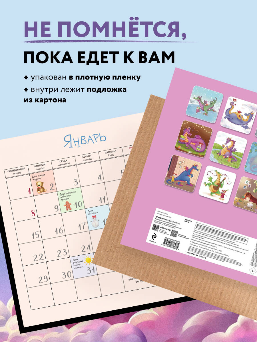 О серии: Наши настенные календари отличаются высоким качеством исполнения! Тщательно подобранные иллюстрации, напечатанные на глянцевой бумаге высочайшего качества, станут настоящим украшением дома, а в календарной сетке найдется место для ваших планов: большие клетки позволят делать записи и организовать свой год! В серии настенных календарей издательства «ЭКСМО» каждый найдет тему по вкусу: великие художники, великолепные подборки с самыми знаменитыми произведениями искусства, легендарные кинематографические саги и игры, главные книжные авторы и бестселлеры, фотографии и иллюстрации любимых животных и многое-многое другое! О календаре: Серия авторских иллюстраций с девочкой и драконом, символом года. В сетке кроме основных праздников отмечены дни дружбы, счастья, мягких игрушек, пряничного человечка, защиты драконов, любви к животным и пр. Кое-где будут философские диалоги между Девочкой и Драконом. Для кого: Высокое качество полиграфического исполнения прекрасно дополняют авторские иллюстрации, созданные талантливой художницей, которые сделают каждый день счастливее. Технические параметры: - Тип календаря - настенный перекидной. - Год - 2024. - Календарная сетка - с разбивкой по месяцам. - Вид скрепления - скрепка. - Ширина - 30 см. - Высота - 30 см. - Внутренний блок - мелованная бумага 150 г/м2. - Подложка - плотный гофрокартон для поддержания формы. - Индивидуальная упаковка в плотный целлофановый пакет.| Издательство | ООО "Издательство "Эксмо" |