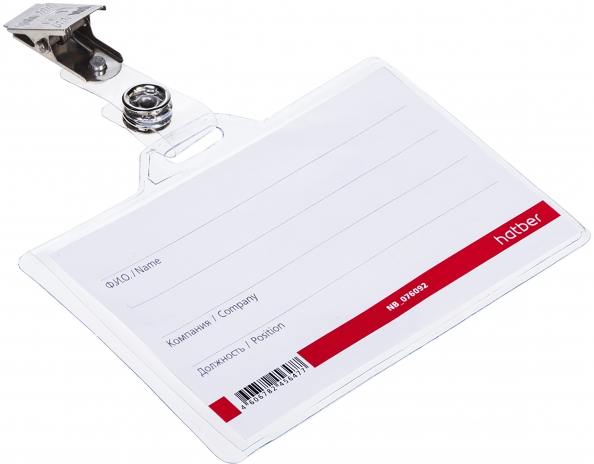 Бейдж изготовлен из плотного прозрачного пластика, представлен в горизонтальном варианте, с клипом.