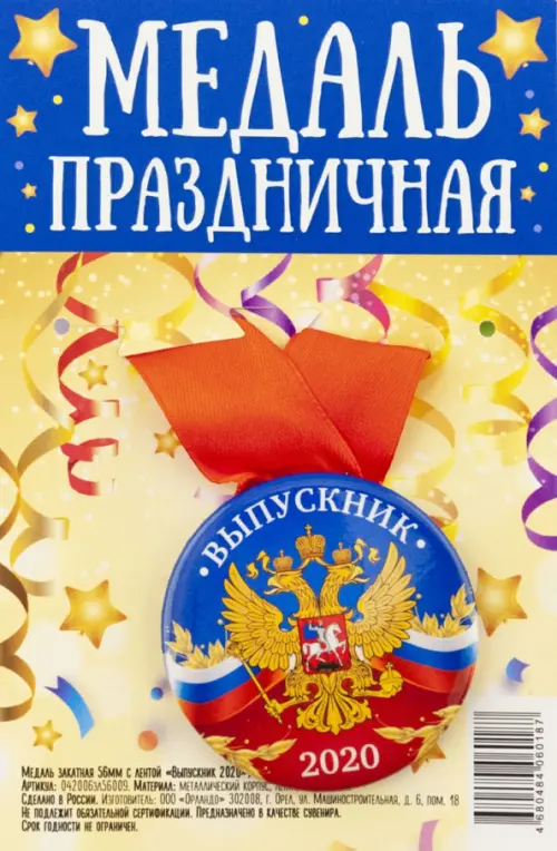 Выпускной - один из самых ответственных праздников для учащихся и их родителей. Поэтому так важно, чтобы воспоминания об этом дне навсегда остались в памяти. Универсальная праздничная медаль изготовлена из металла и укомплектована яркой атласной лентой. Медаль имеет солидный, презентабельный вид. Диаметр медали: 56 мм. Яркая медаль на ленте в подарочной упаковке. Материалы: металлический корпус, лента, полиграфия. Сделано в России.
