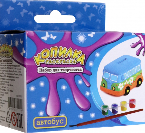 В комплекте: копилка, краски 4 цветов, кисточка.
