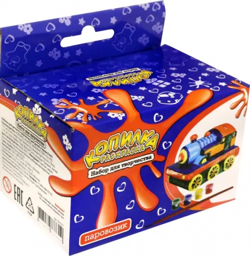 В комплекте: белая копилка, краски 4 цветов, кисточка.