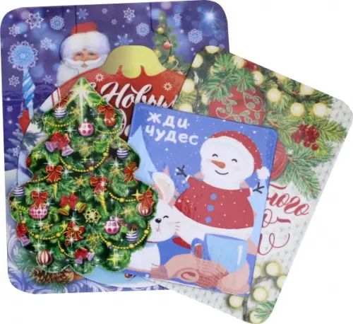 Набор состоит из 5 красочных новогодних магнитов разной формы, размера и способа изготовления.