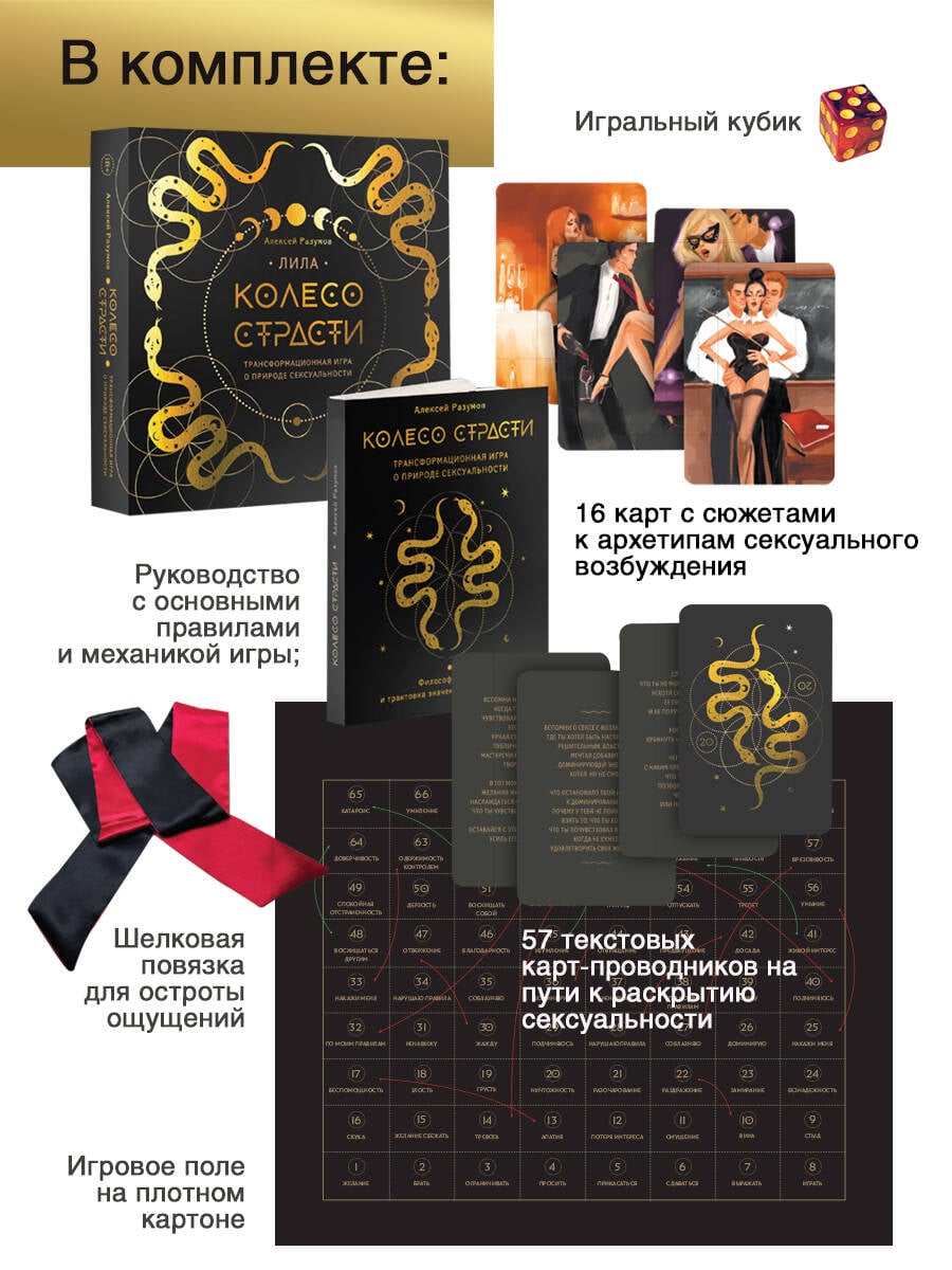 Алексей Разумов - автор и наставник игры "Колесо страсти", магистр психологии (PWI, Портленд, США), международный тренер и супервизор, психотерапевт, член Международной ассоциации процесс-ориентированной психологии (IAPOP), основатель и ведущий курсов школы Razumov Love School, специалист по работе с сексуальностью и магнетизмом. Провел тысячи консультаций и тренингов по раскрытию сексуальности и работе с блокирующими сексуальную свободу внутренними установками и ограничениями. Помог сотням людей преодолеть внутренние препятствия, мешающие наслаждаться сексом, улучшить интимные отношения и обрести энергетическую целостность. Из точки A в точку B через точку G "Колесо страсти" - трансформационная игра о природе сексуальности на основе древнеиндийской игры "Лила", позволяющей проанализировать свой жизненный путь и скорректировать направление движения, и авторского Метода магнетизма, помогающего изменить свою жизнь через исследование феноменов сексуальности. Слияние этих инструментов даст тебе возможность проработать свои сексуальные фантазии и желания в безопасной и поддерживающей среде и увеличить получаемое от секса удовольствие. Препятствия в сексуальной жизни - страхи, тревоги, неуверенность в себе, неудовлетворенные желания - приводят к эмоциональной отстраненности от партнера и потере интереса к сексу. "Колесо страсти" станет ключом к расширению пространства сексуальной свободы, гармонизации твоего внутреннего мира и умножению энергии либидо. В комплекте: • Игральный кубик из аметиста; • Игровое поле на плотном картоне; • Руководство с основными правилами и механикой игры; • 57 текстовых карт-проводников на пути к раскрытию сексуальности; • 16 карт с сюжетами к архетипам сексуального возбуждения; • Шелковая маска для остроты ощущений.